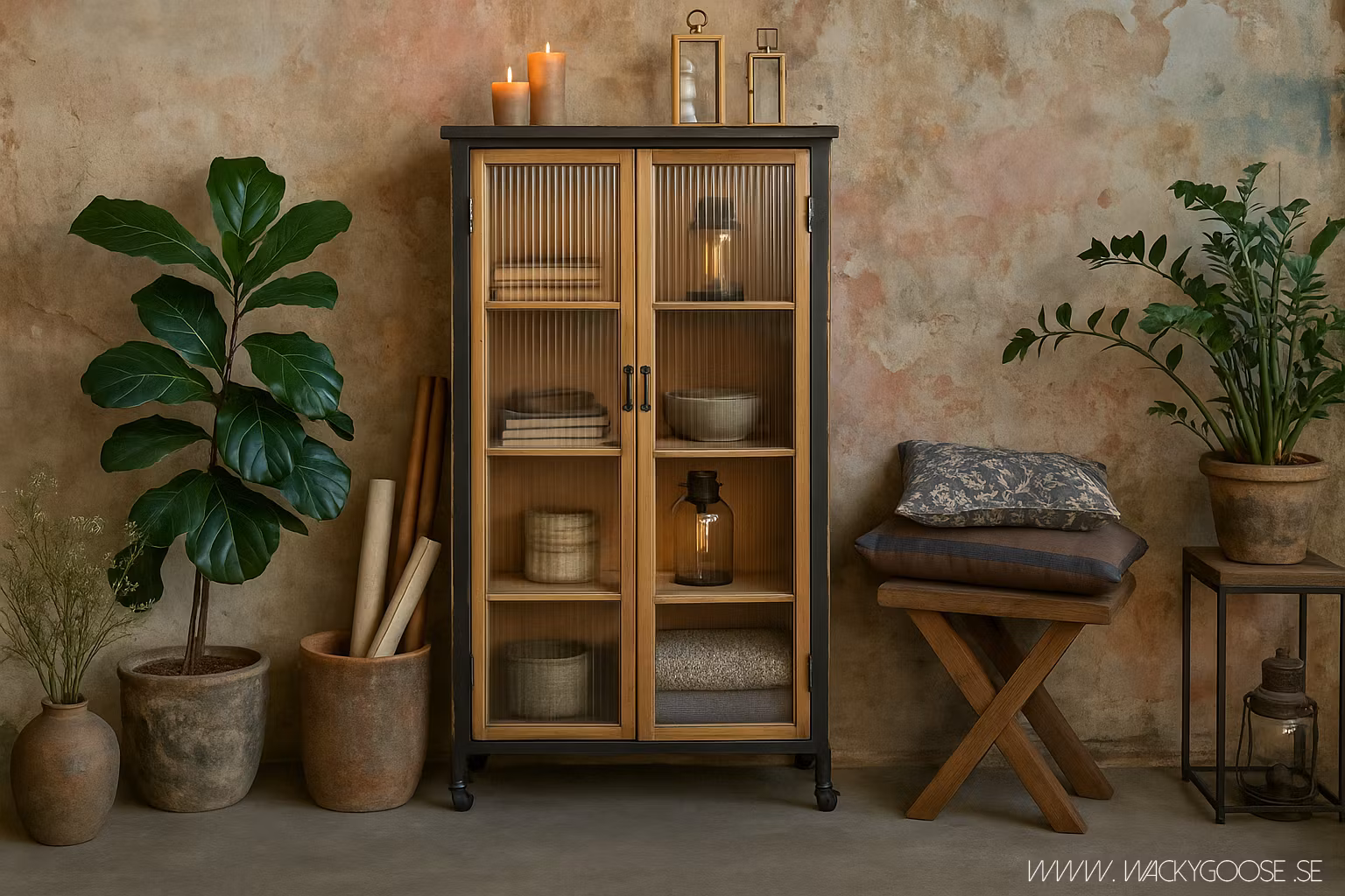 Detta vackra och iögonfallande vitrinskåp kommer inte att förbises i ditt hem. Skåpet kommer att ta väl hand om dina skatter och vackert visa upp dem bakom glasdörrarna.