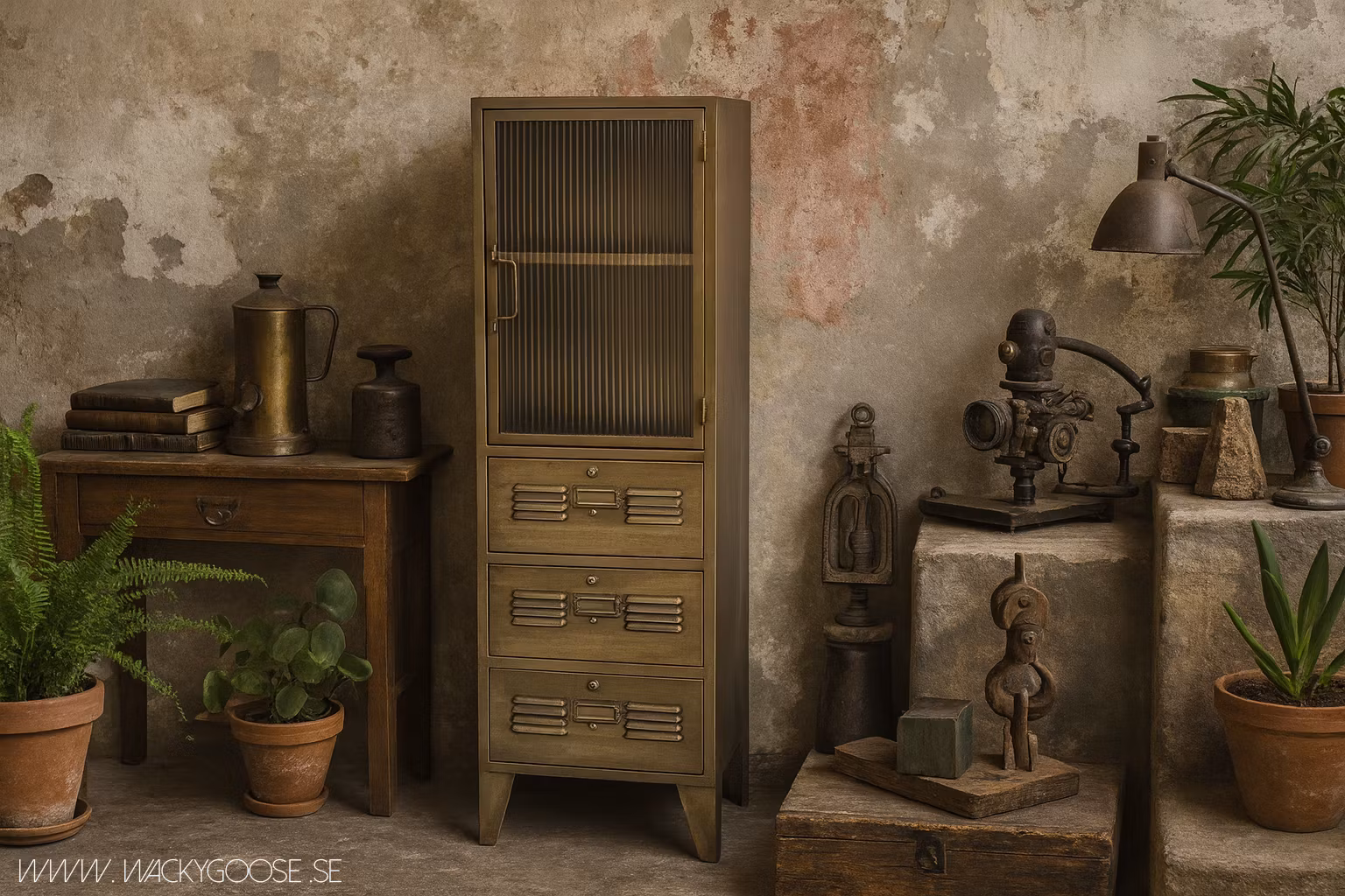 Ett elegant vitrinskåp som kombinerar robust industriell känsla med sofistikerad antik charm. Skåpet har luckor i järn med vacker antikmässingfinish som ger en varm och exklusiv karaktär. Perfekt för att visa upp dina finaste glas, porslin eller samlarföremål, samtidigt som det skyddar mot damm.