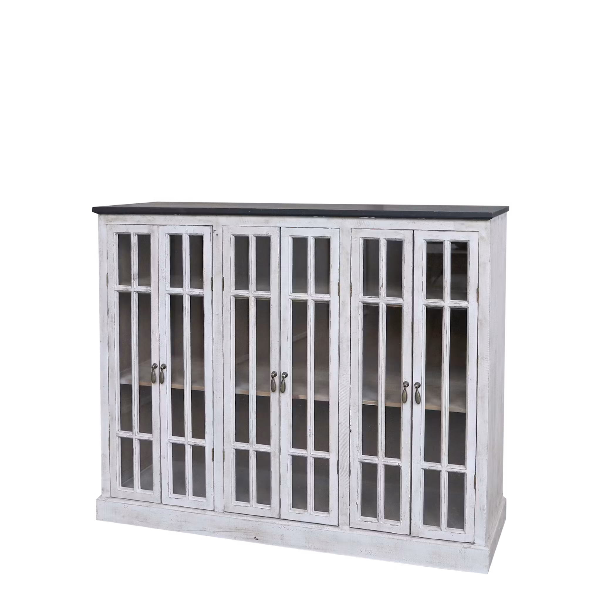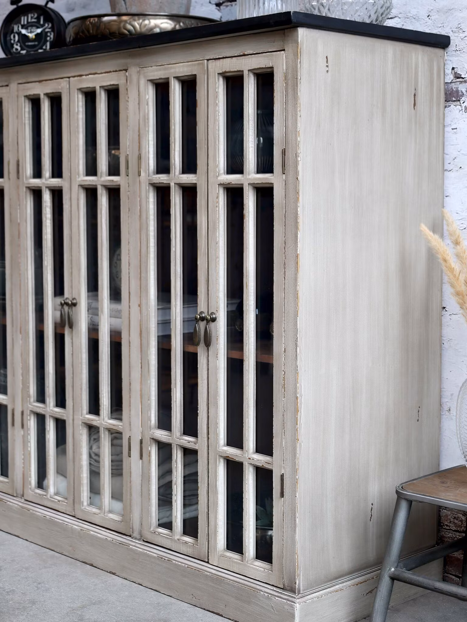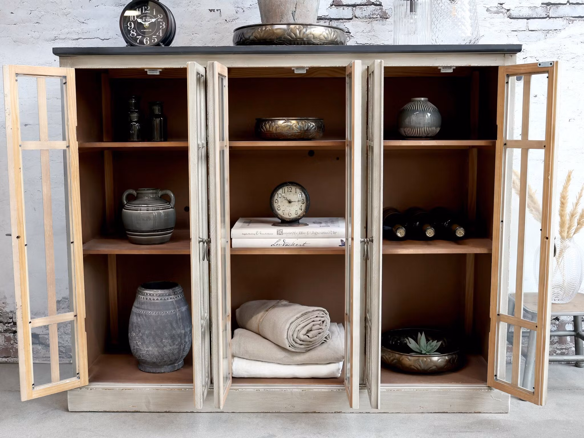 Ett stilfullt vitrinskåp/skänk i generös storlek som kombinerar praktisk förvaring med tidlös design. Den sandfärgade kroppen skapar en varm och mjuk känsla medan den svarta toppskivan ger en elegant kontrast och modern touch. De tre dörrarna med glasrutor gör det enkelt att visa upp vackra inredningsdetaljer, porslin eller glas, samtidigt som de skyddas från damm.