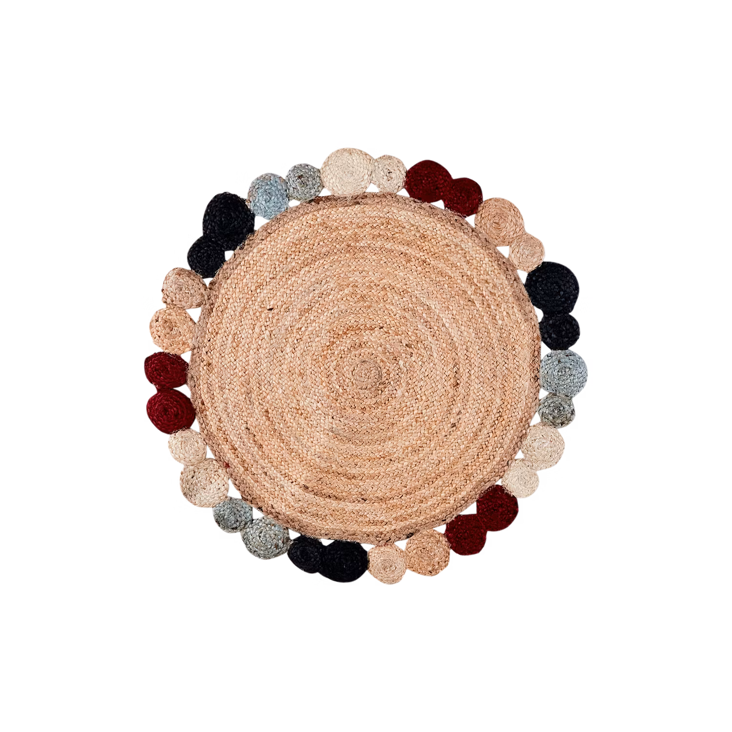 Den här lilla mattan stjäl verkligen showen! En rund jutematta med färgglada detaljer är som en festival för dina fötter - och ja, den är lika bra på att pigga upp ett vardagsrum som att bli bästa kompisen på balkongen.