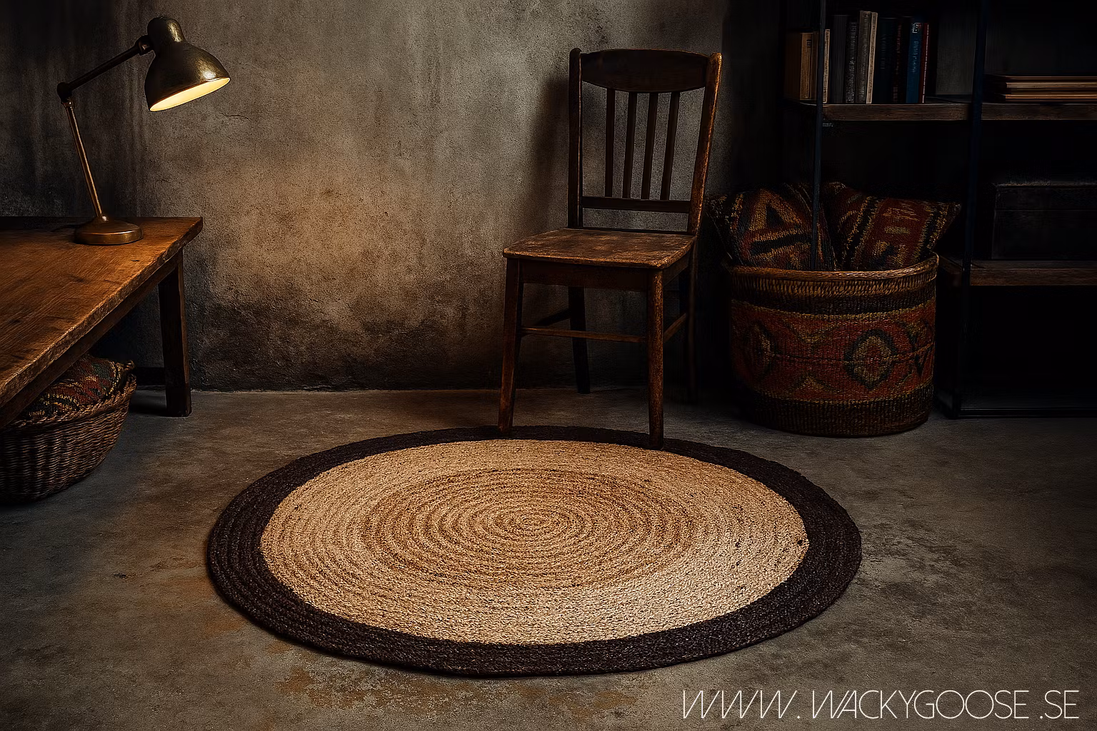 Lyft känslan i ditt rum med denna vackra, runda matta - tillverkad av slitstark, naturlig jute och kantad med en elegant mörk nyans som ramar in mattan och ger extra karaktär. Perfekt för dig som vill addera en rustik, bohemisk eller skandinavisk känsla till hemmet.