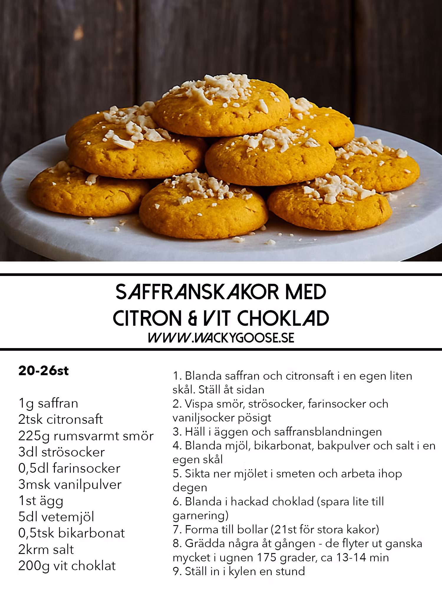 Här bjuder vi på receptet på Linas SAFFRANSKAKOR MED CITRON OCH VIT CHOKLAD, uppe bland bilderna ser du både ingredienser och hur du ska göra!