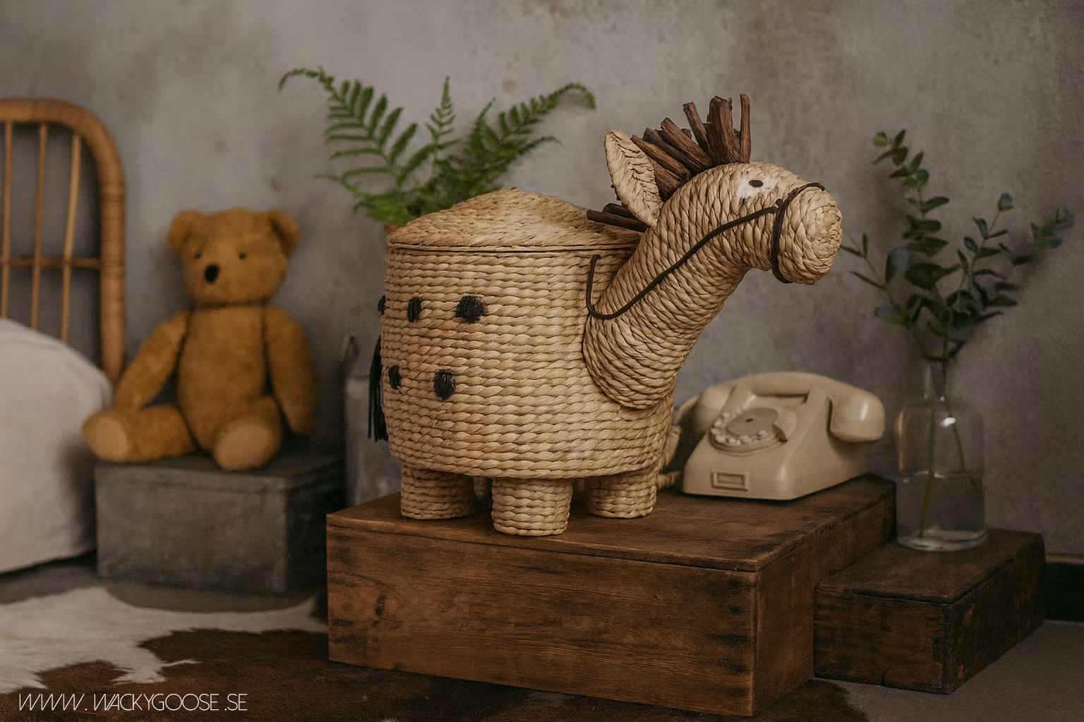 Bobbi-korgen med lock från Bloomingville MINI är perfekt för förvaring och samtidigt en rolig lekkamrat. Den hästformade korgen har ett lock som enkelt kan tas bort, så att det är enkelt för små händer att gripa tag i nallar och leksaker, samt att lägga undan dem igen.