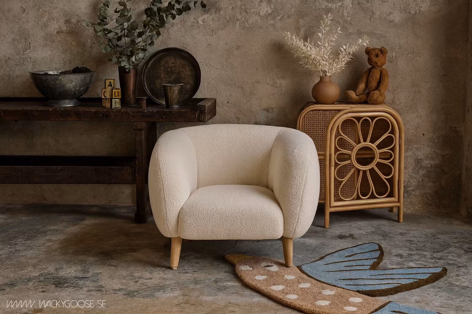 Cade Lounge Chair från Bloomingville MINI är designad för familjens minsta medlemmar. Den lilla, mjuka fåtöljen är perfekt för att ge barnet ett eget utrymme i vardagsrummet eller som ett dekorativt element i barnrummet.