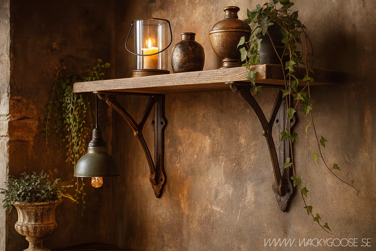 Ett set med 2 robusta konsoler i gjutjärn, perfekta för att skapa hyllor med en rustik och industriell känsla. De vackert ornamenterade konsolerna i brun/svart ton har en tidlös design som passar lika bra i lantliga som moderna inredningar. Använd dem som hyllkonsoler i kök, hall eller vardagsrum för en personlig och hållbar lösning.
