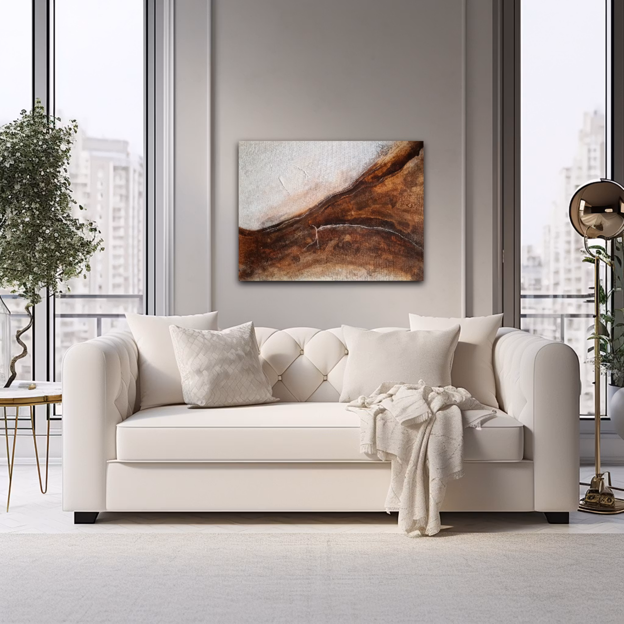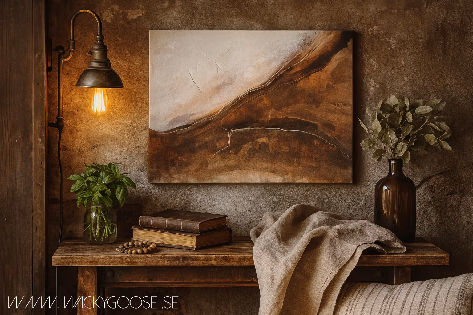 Låt värmen flöda genom rummet med "Amber" - en abstrakt målning som fångar känslan av bärnsten, jord och glödande stillhet. Med djupa nyanser av rost, karamell och mjuk beige skapar tavlan en varm och inbjudande atmosfär, perfekt för dig som vill inreda med själ och naturlig elegans.