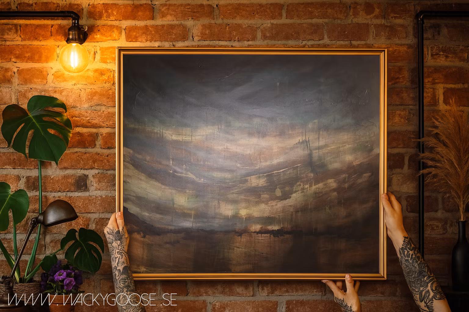 Denna handmålade tavla passar perfekt över en soffa, i hallen eller som ett kraftfullt centerpiece i ett modernt, industriellt eller rustikt hem. De matta färgfälten och de subtila texturerna skapar en levande känsla utan att bli påträngande - en balans mellan kraft och harmoni.