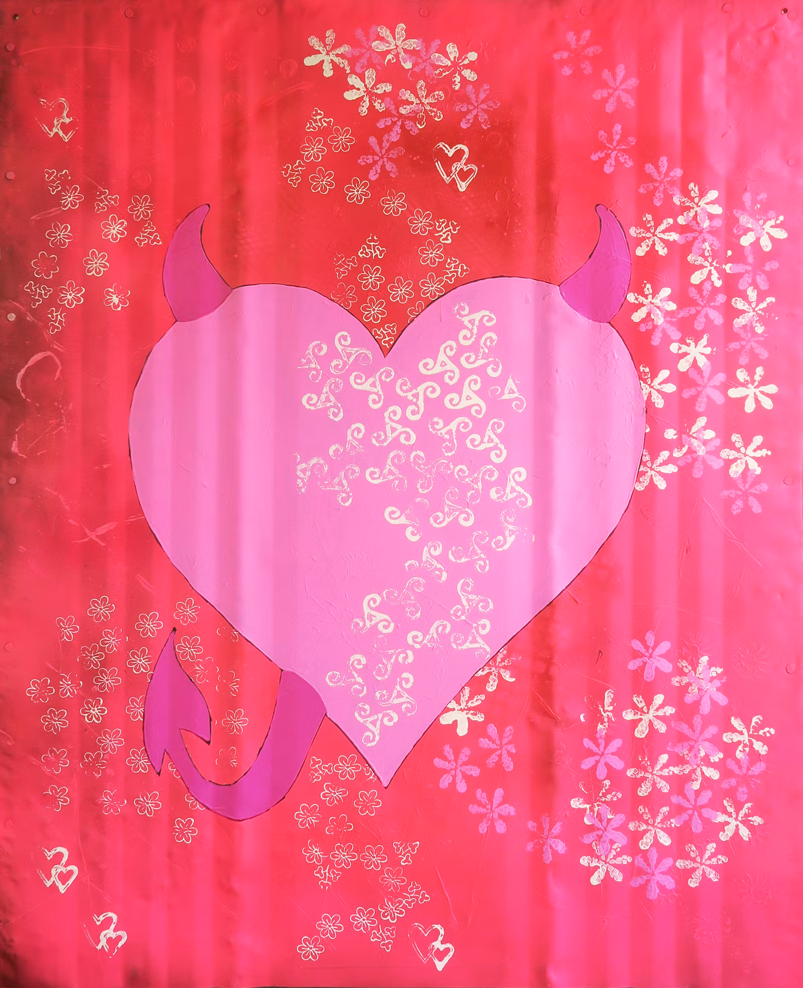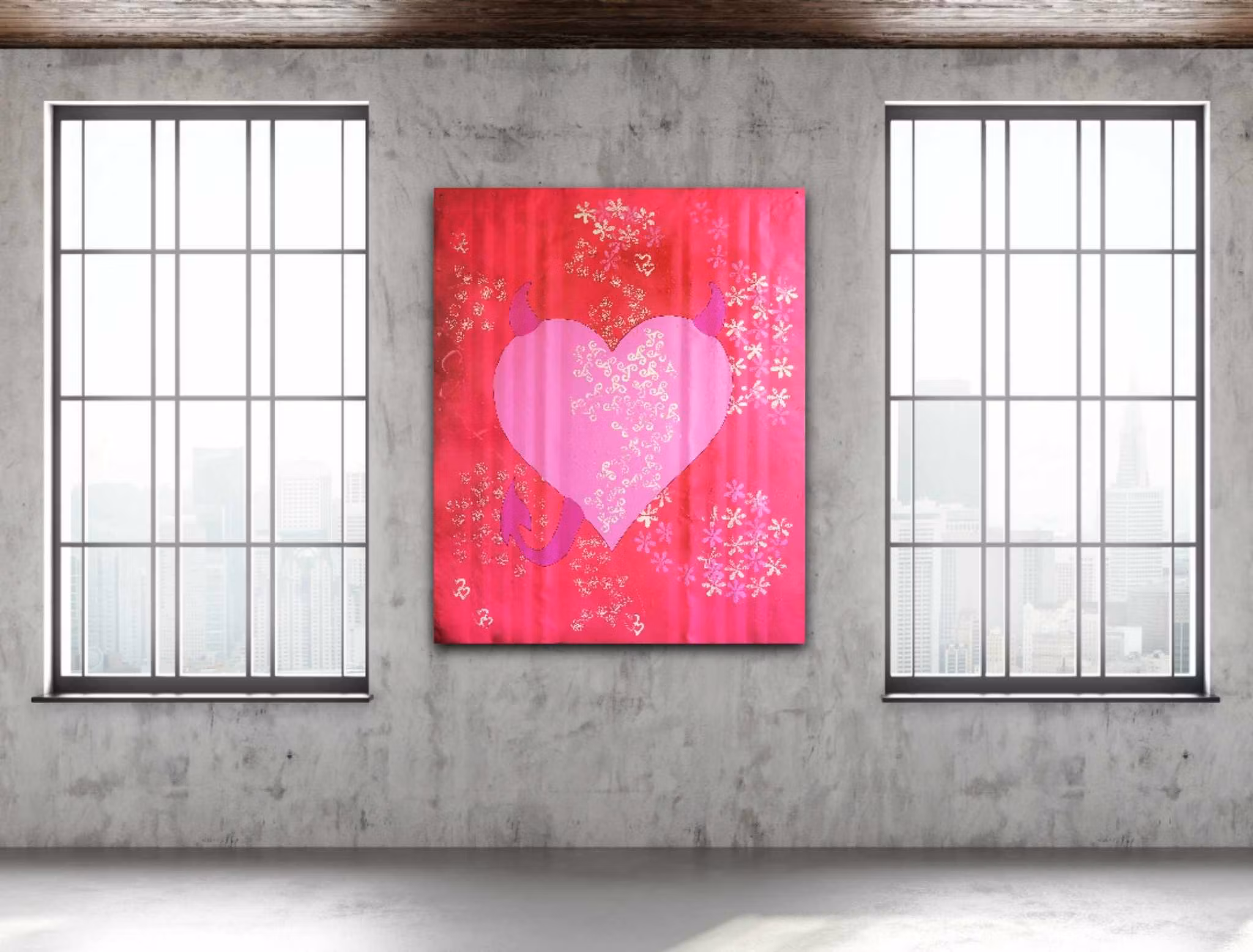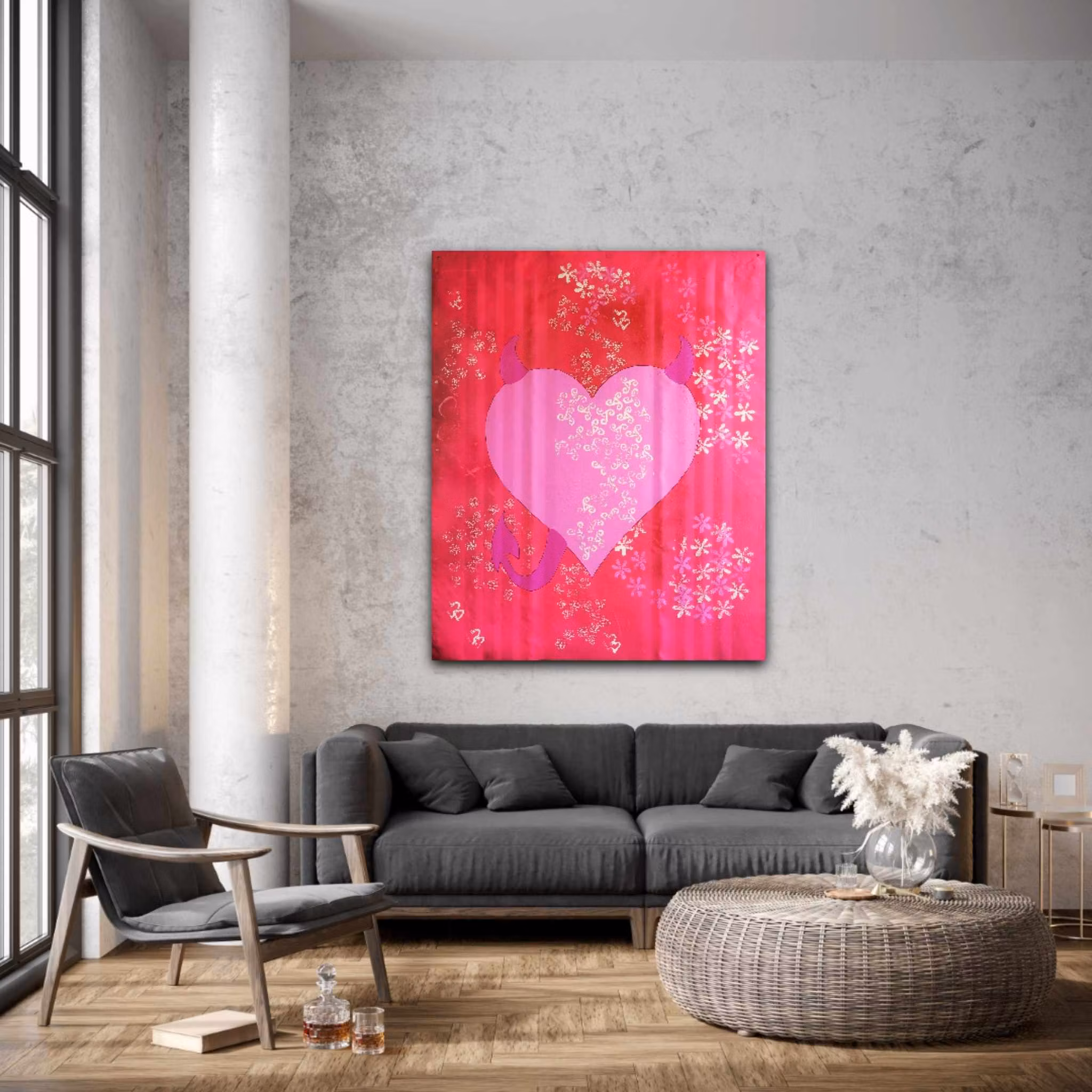 Letar du efter en stor tavla som verkligen sticker ut? Denna unika akrylmålning på perforerad plåt kombinerar rå industriell känsla med lekfull konstnärlig design. Ett stort rosa hjärta med djävulshorn och svans står i centrum - omgivet av tryck med blommor och mjuka former i rosa, rött och lavendel. Varje detalj är målad för hand med akrylfärg, vilket gör varje tavla helt unik och personlig.
