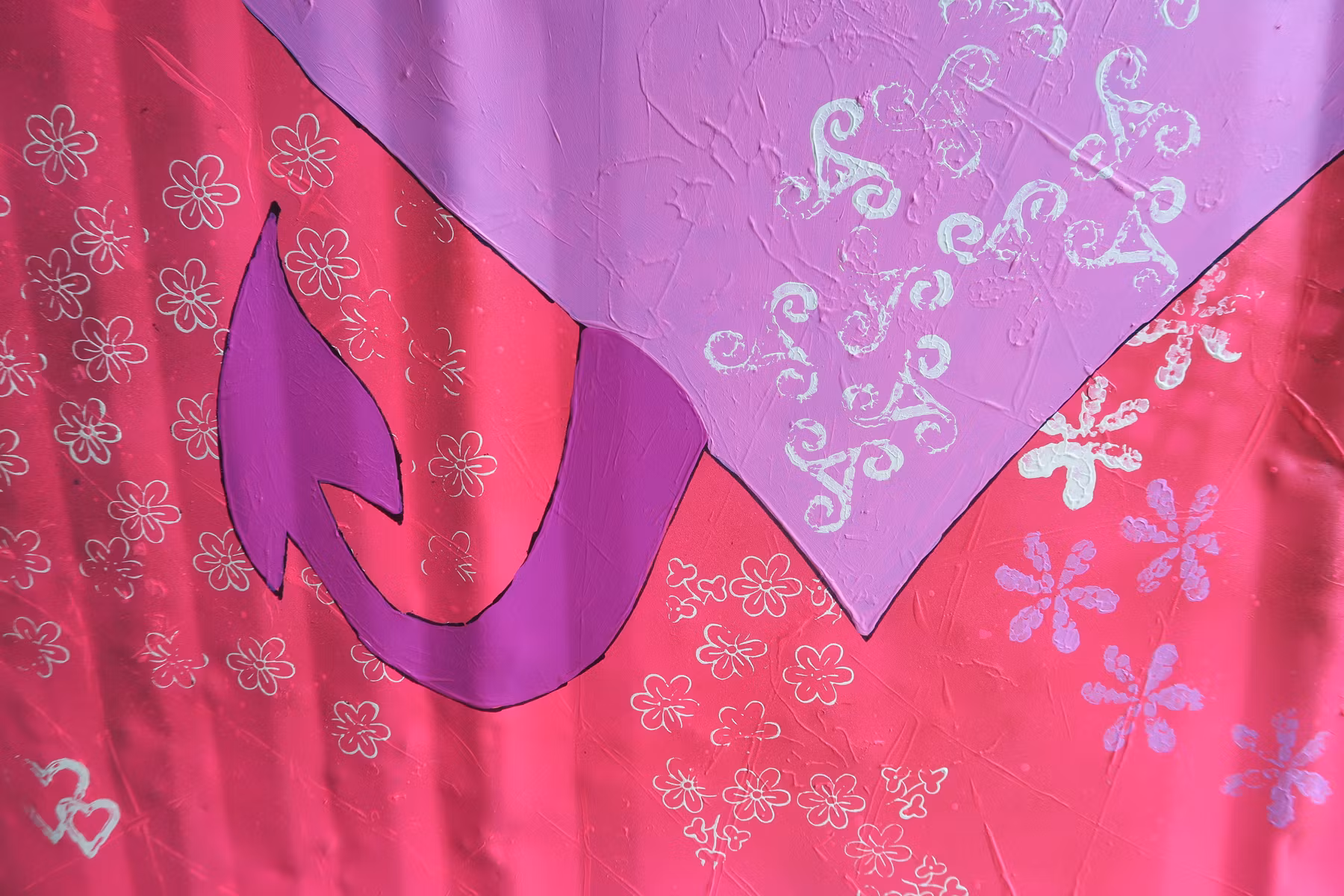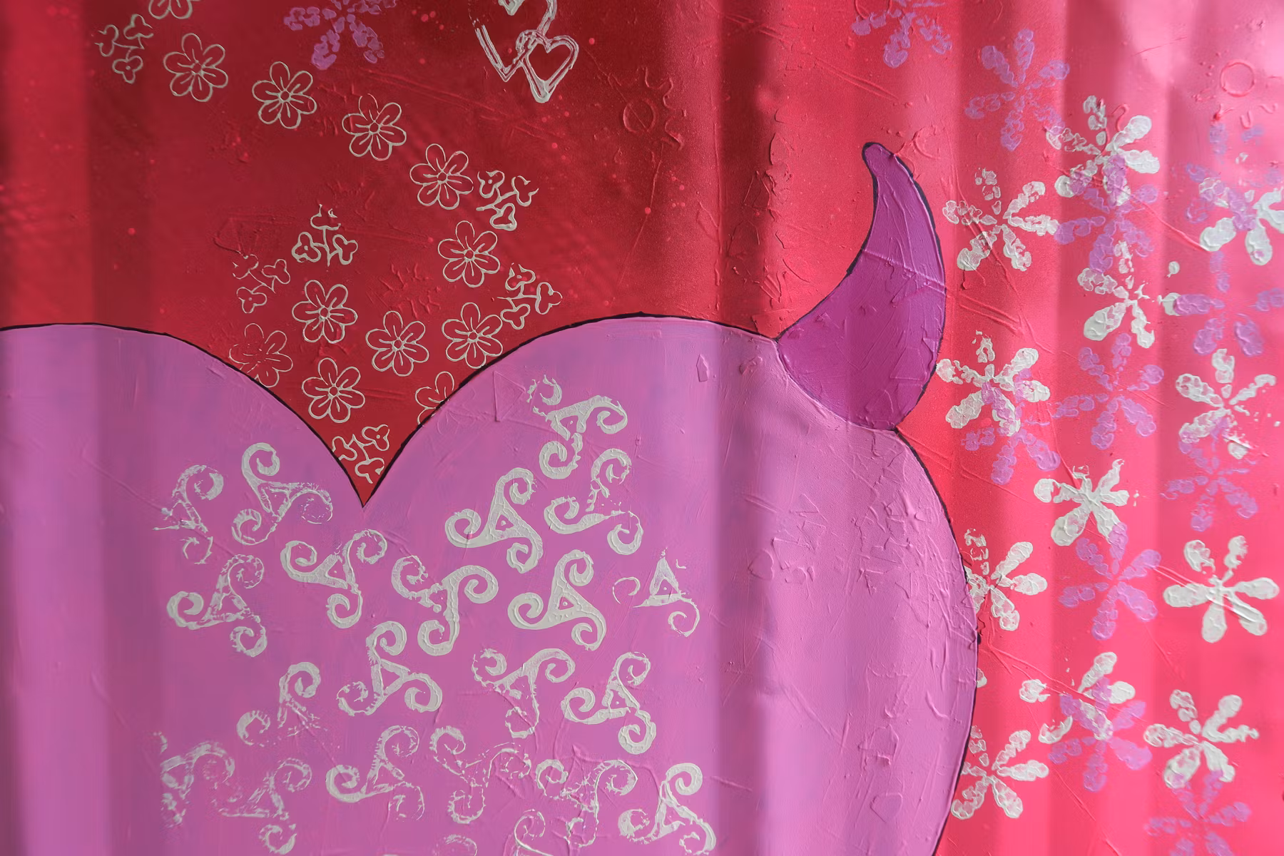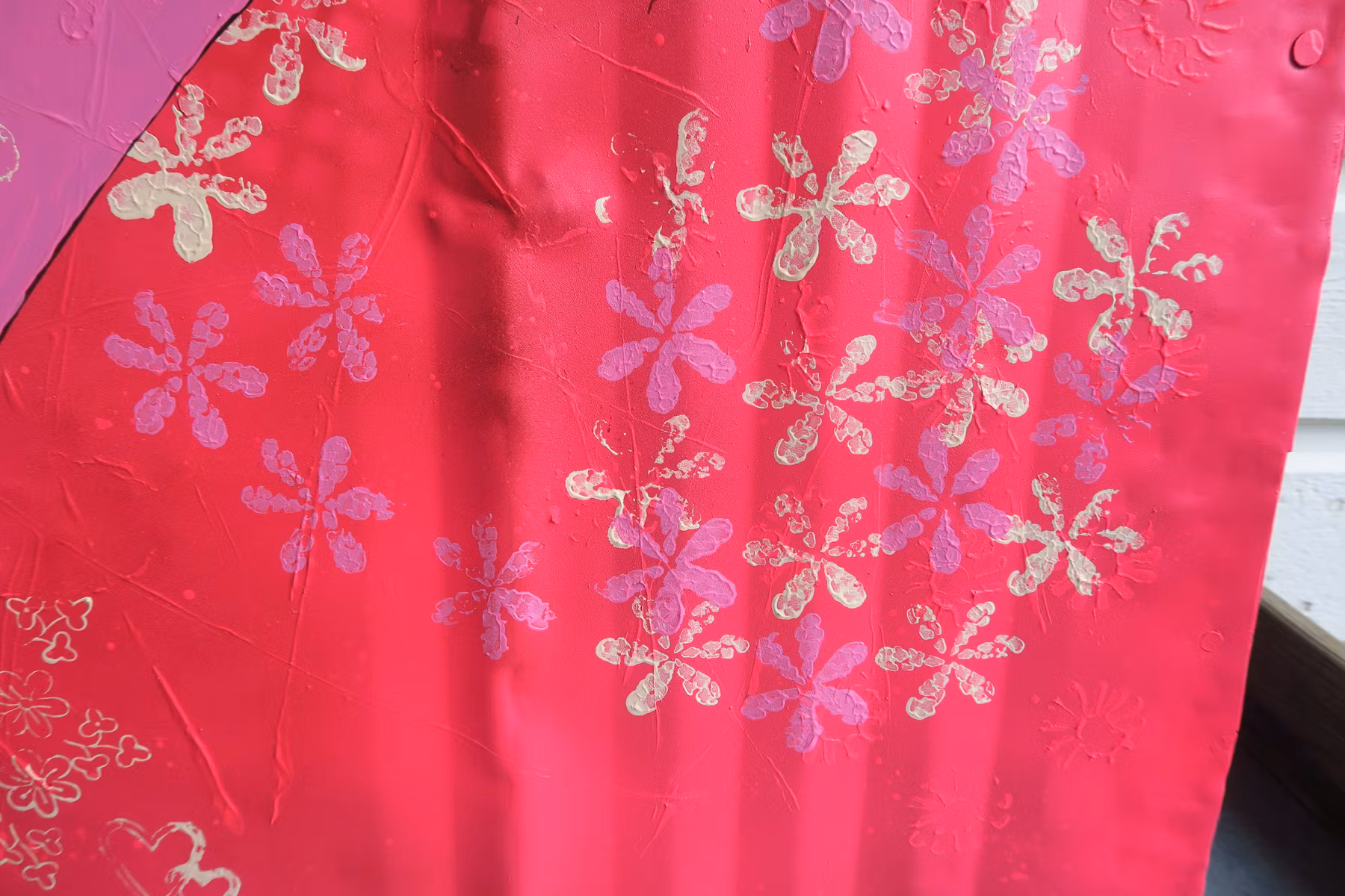 Letar du efter en stor tavla som verkligen sticker ut? Denna unika akrylmålning på perforerad plåt kombinerar rå industriell känsla med lekfull konstnärlig design. Ett stort rosa hjärta med djävulshorn och svans står i centrum - omgivet av tryck med blommor och mjuka former i rosa, rött och lavendel. Varje detalj är målad för hand med akrylfärg, vilket gör varje tavla helt unik och personlig.