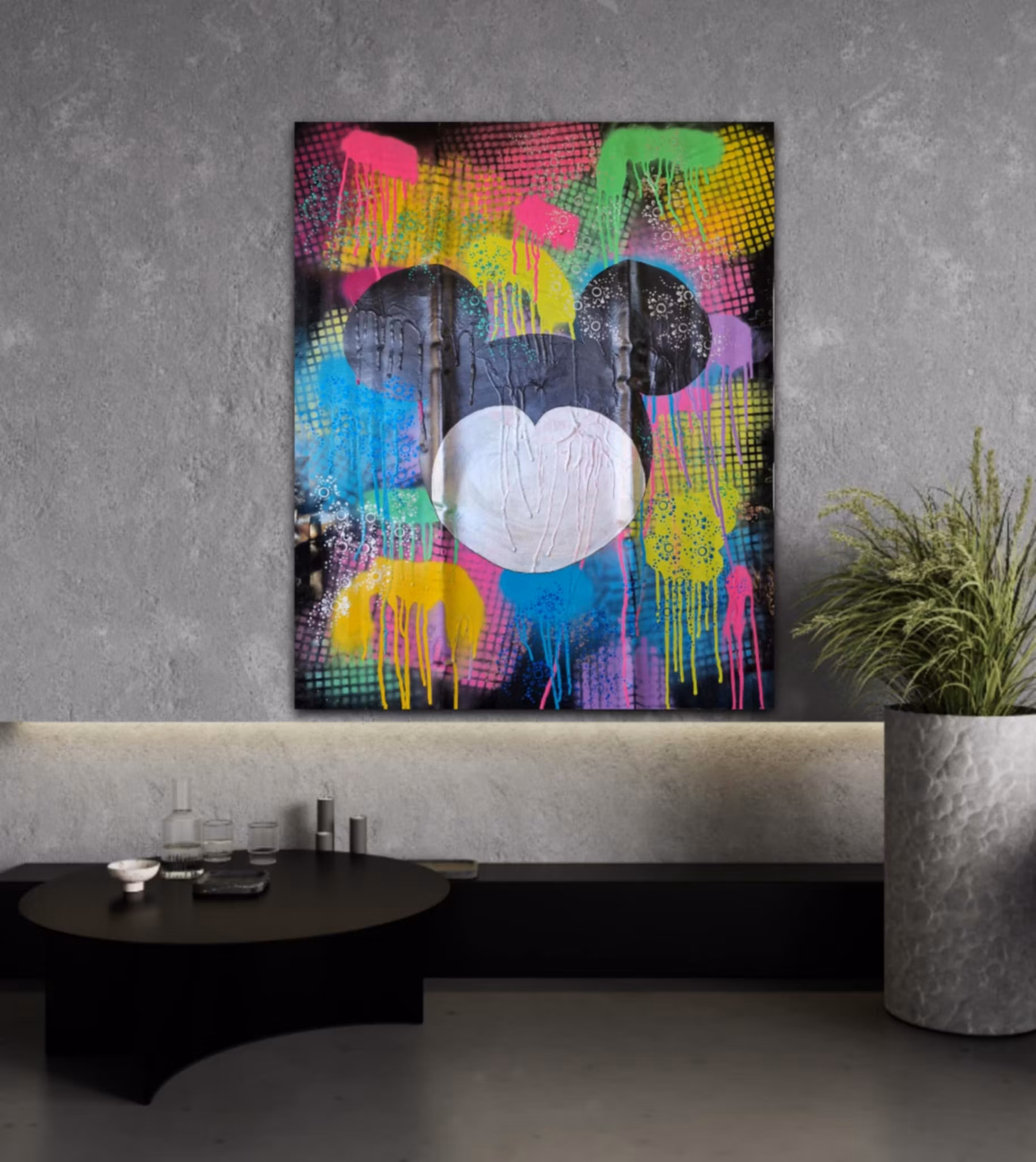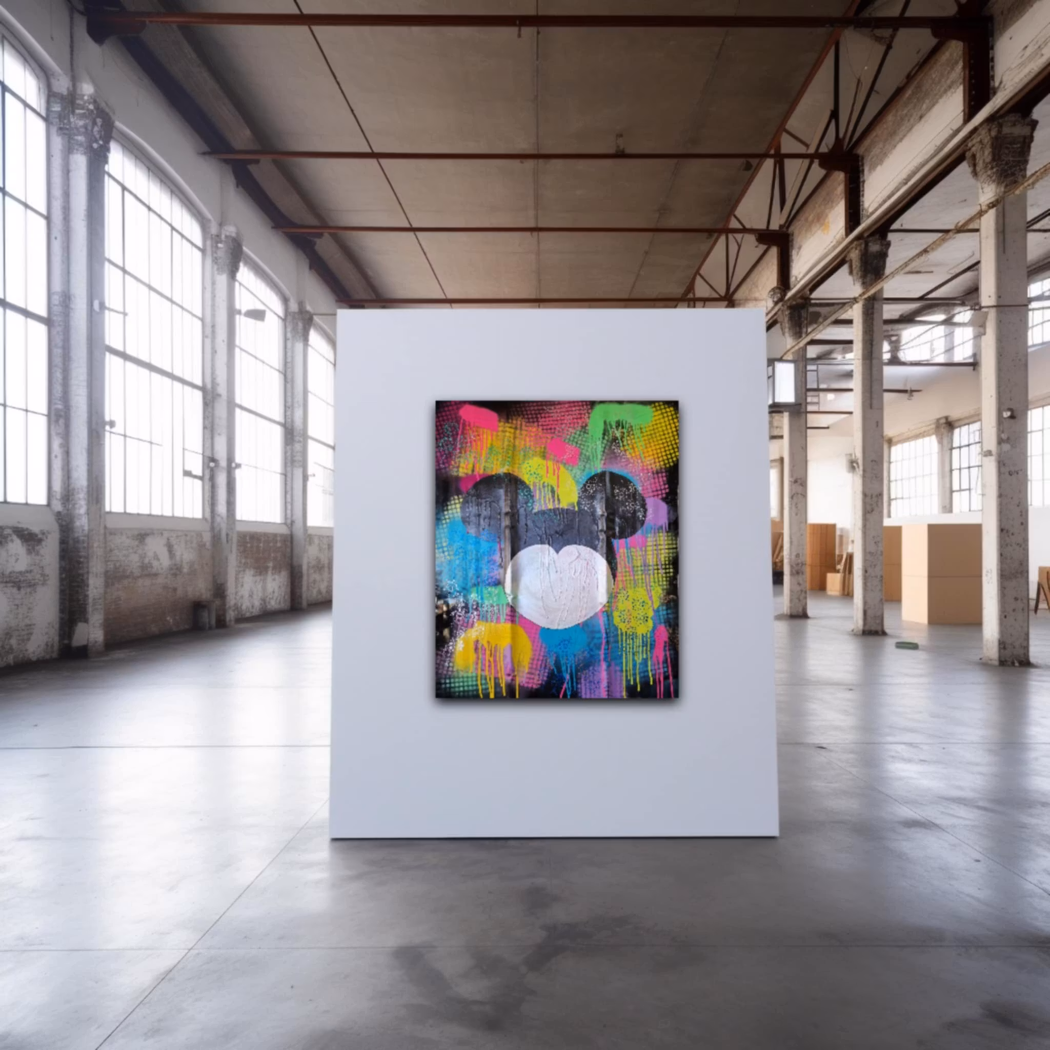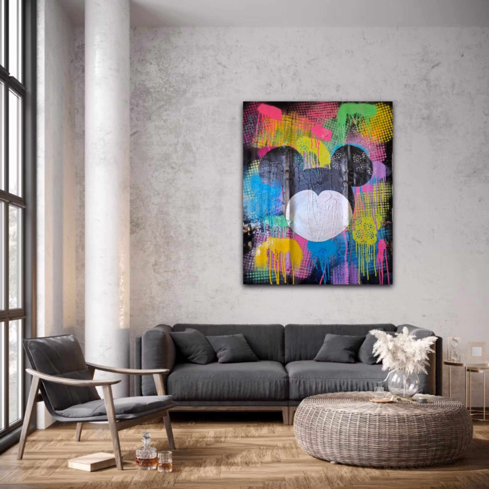 Letar du efter en stor tavla som verkligen sticker ut? Denna unika akrylmålning på perforerad plåt kombinerar rå industriell känsla med lekfull konstnärlig design. Tavlan är målad med olika tekniker, både stämplar, pensel och sprayburkar. I centrum står en Musse-variant vilken är omgiven av lekfulla färger i både pastell och neon.