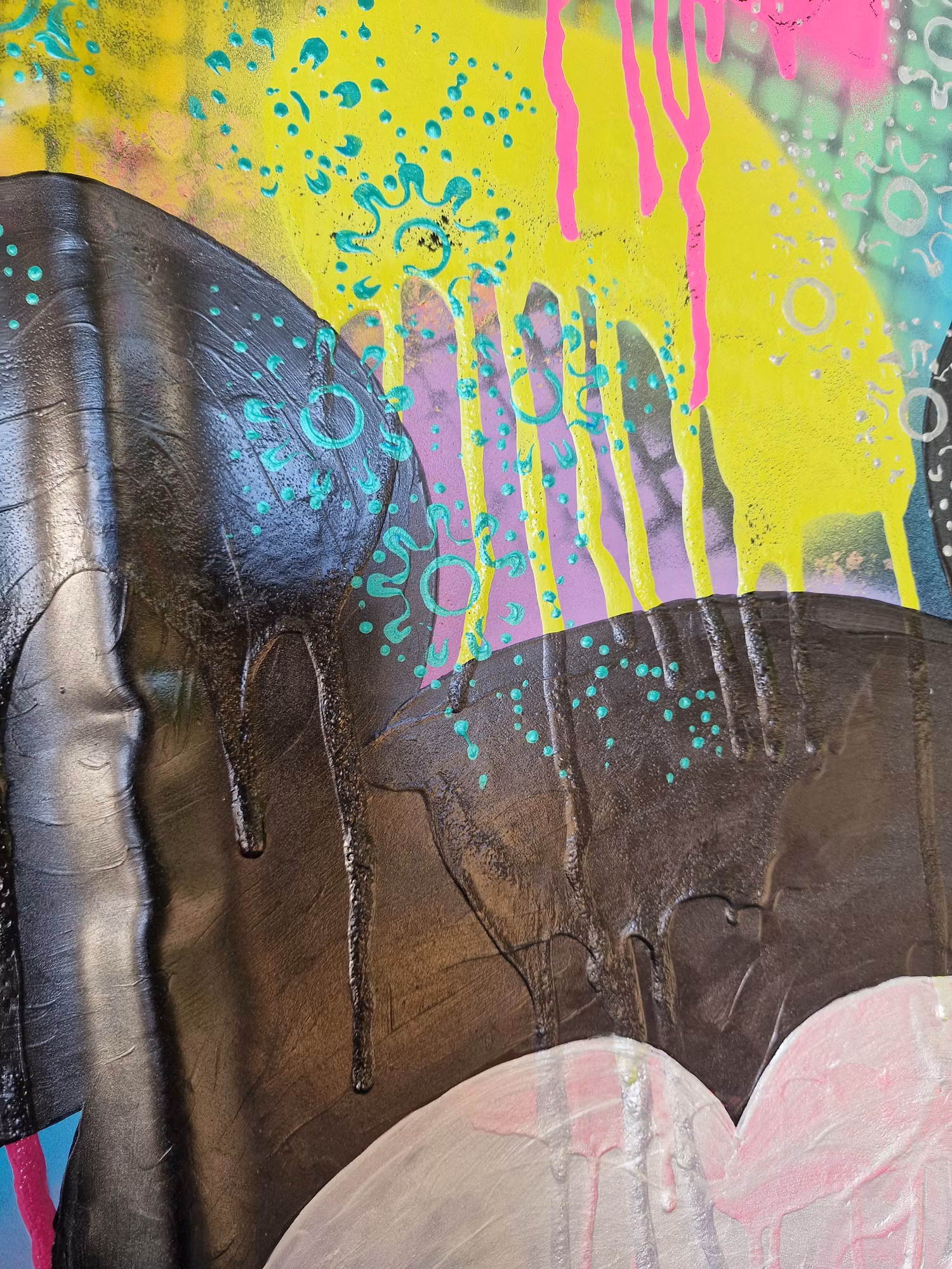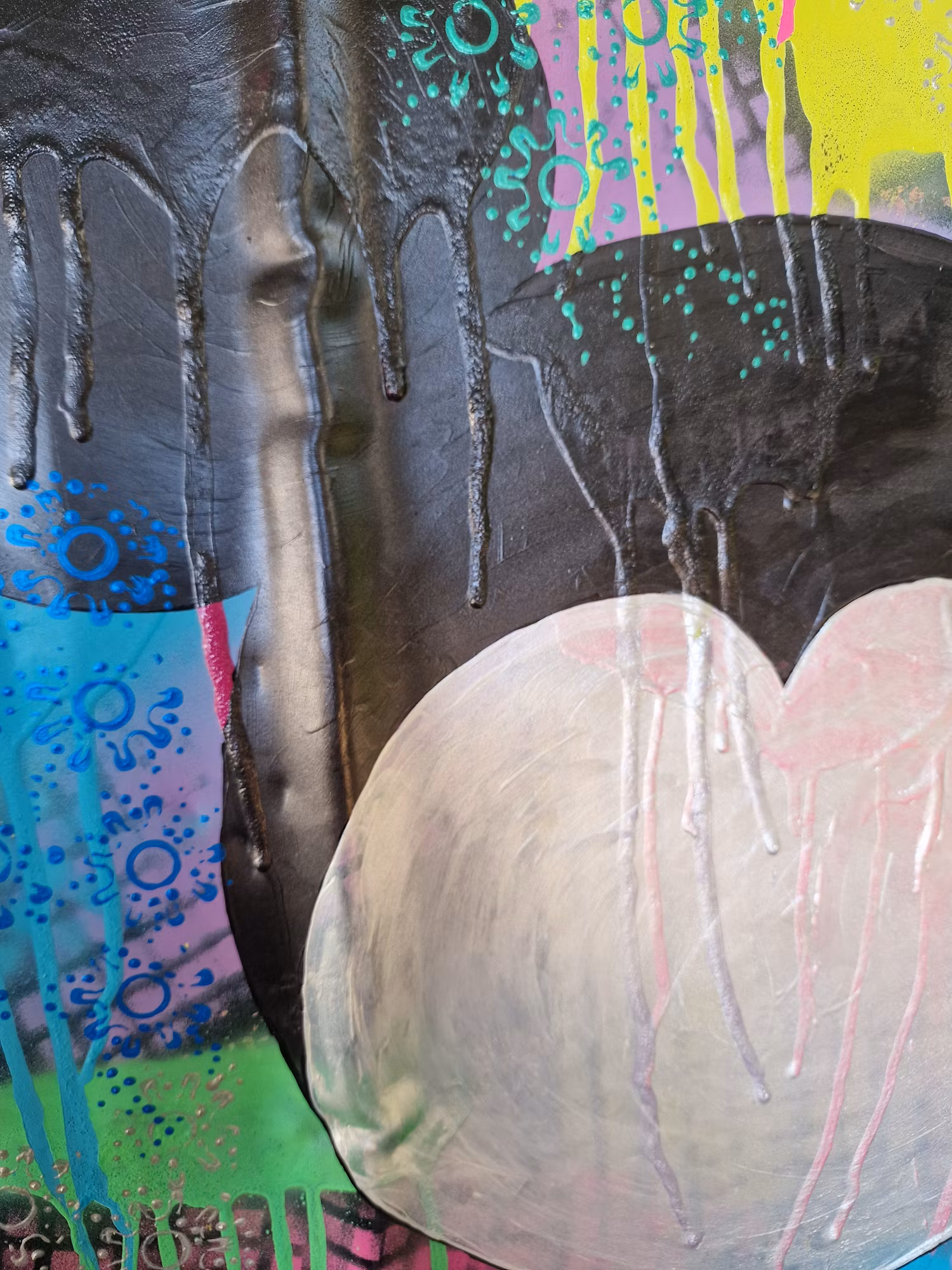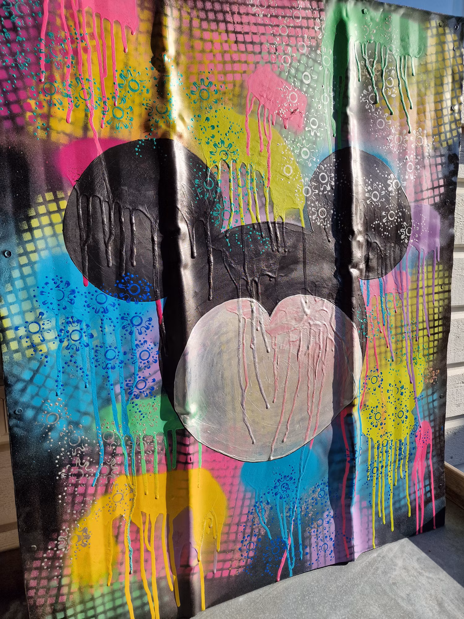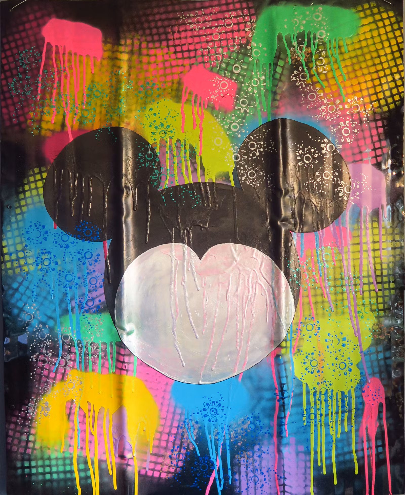 Letar du efter en stor tavla som verkligen sticker ut? Denna unika akrylmålning på perforerad plåt kombinerar rå industriell känsla med lekfull konstnärlig design. Tavlan är målad med olika tekniker, både stämplar, pensel och sprayburkar. I centrum står en Musse-variant vilken är omgiven av lekfulla färger i både pastell och neon.