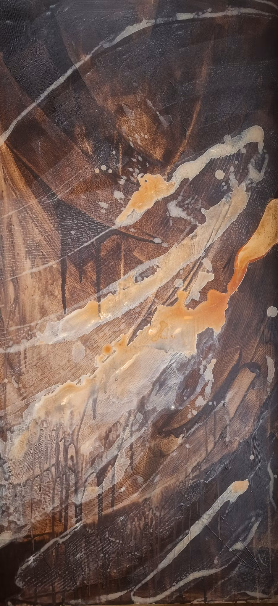 Upptäck denna abstrakta tavla i varma jordtoner, perfekt för dig som vill addera djup, harmoni och stil till ditt hem. Med svepande penseldrag och rinnande färg i nyanser av brunt, beige, rost och vitt, skapas ett uttrycksfullt konstverk som ger ett lugnt med samtidigt kraftfullt intryck.
