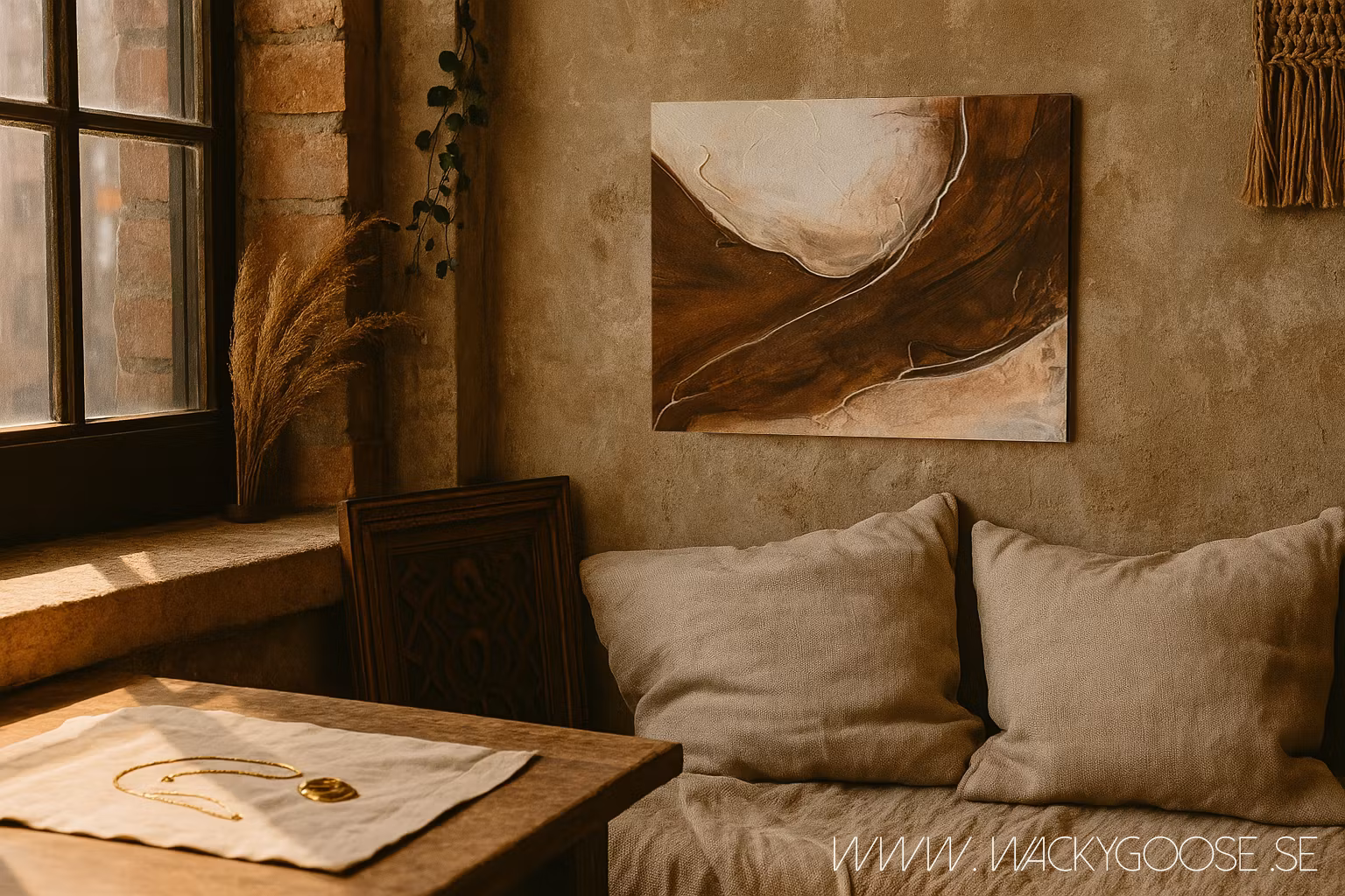 Perfekt att placera i sovrum, vardagsrum eller i en mysig läshörna - denna målning förstärker en bohemisk, rustik eller skandinavisk stil på ett subtilt men uttrycksfullt sätt.