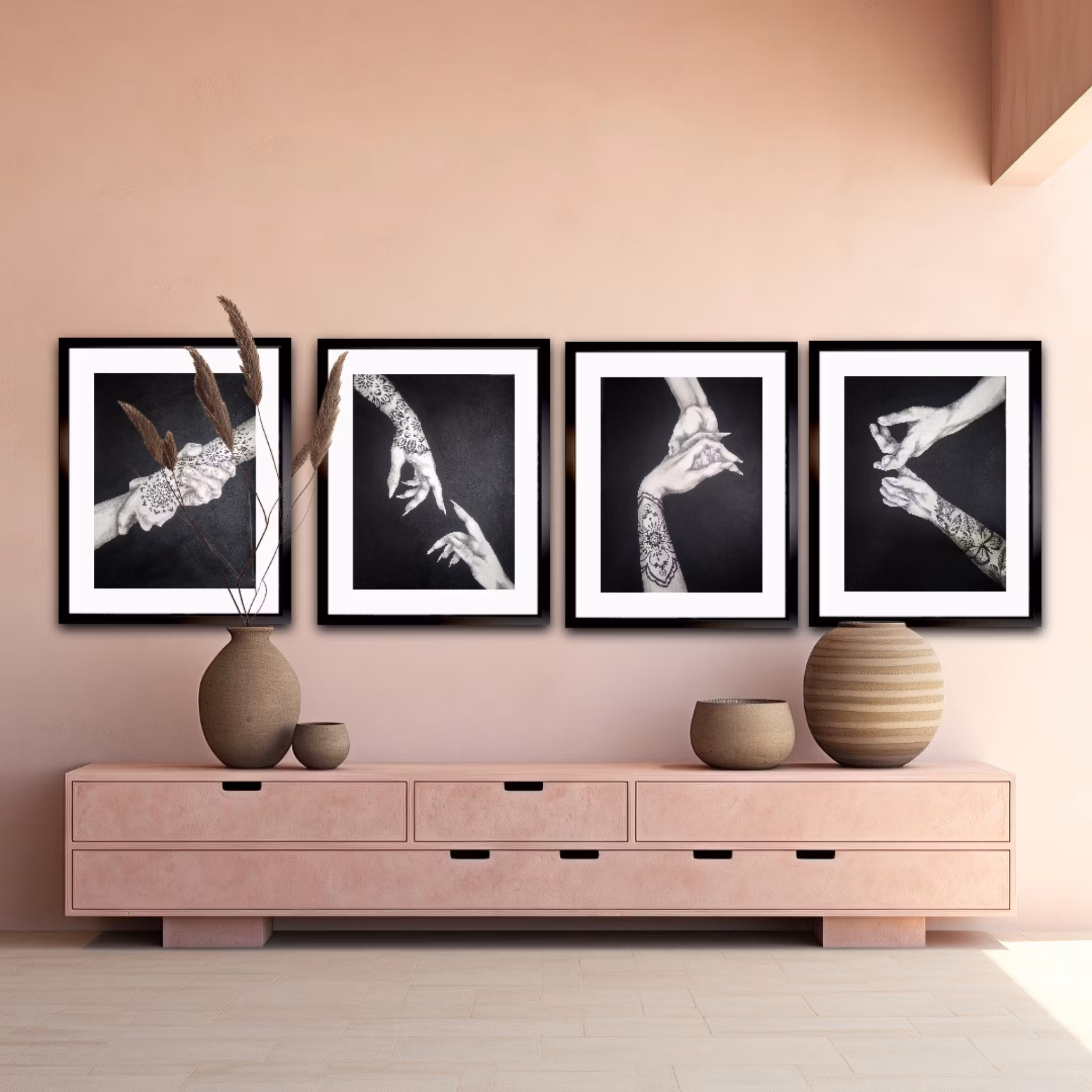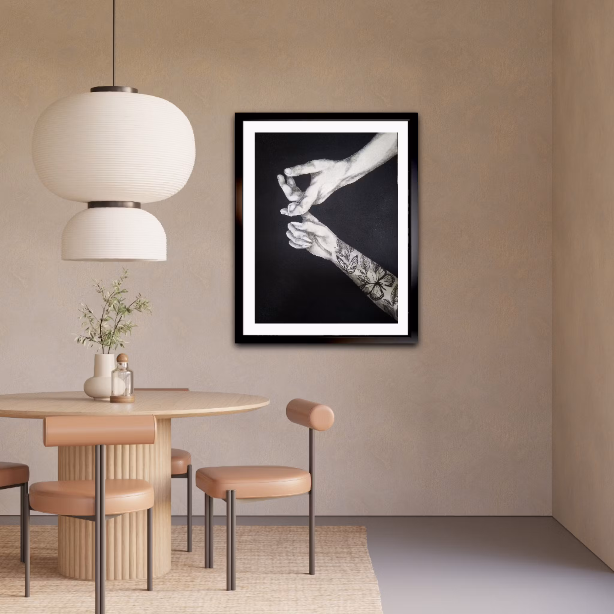 "Stay Close" är en innerlig och känsloladdad målning som fångar ögonblicket innan kontakt - det där tysta, laddade mötet mellan två händer.