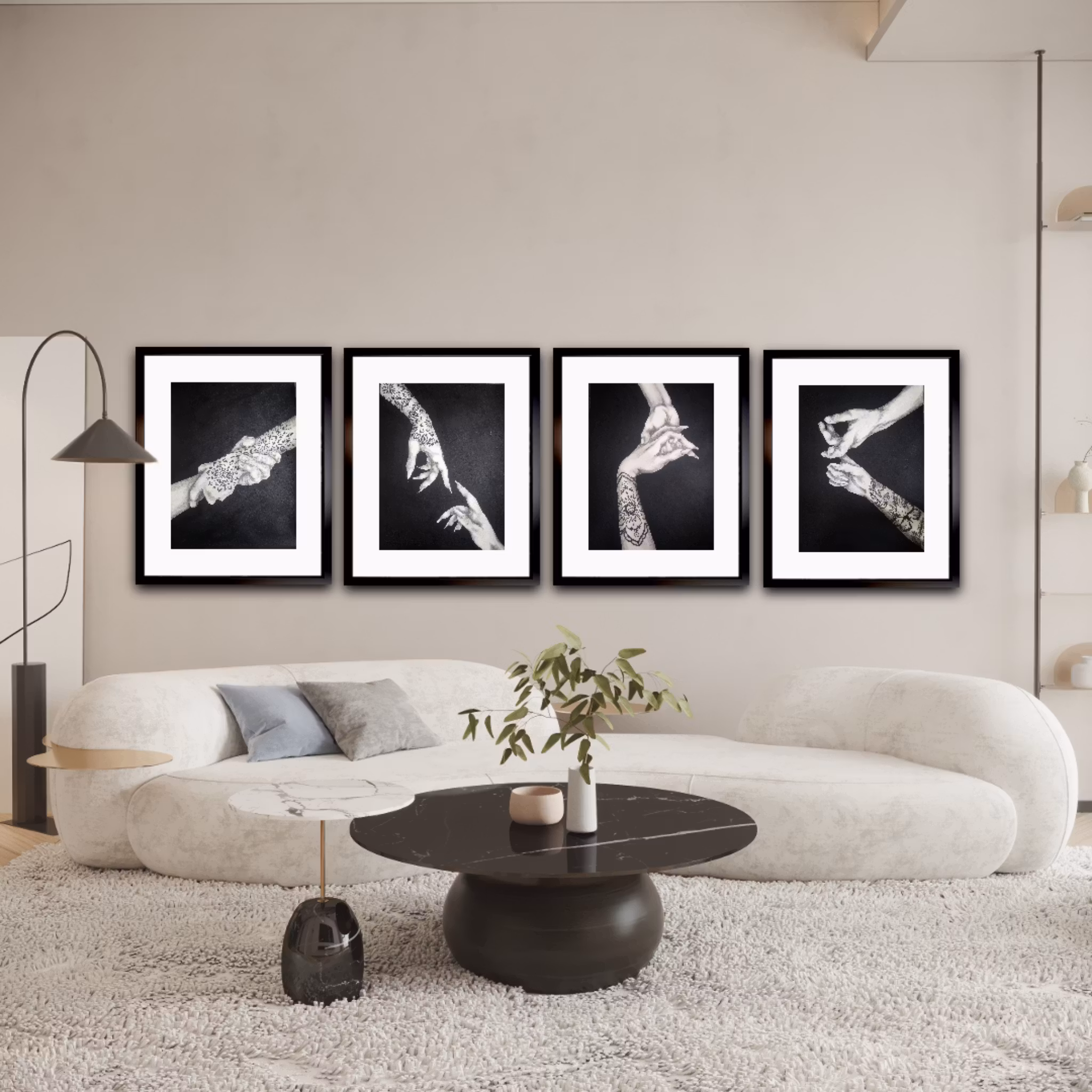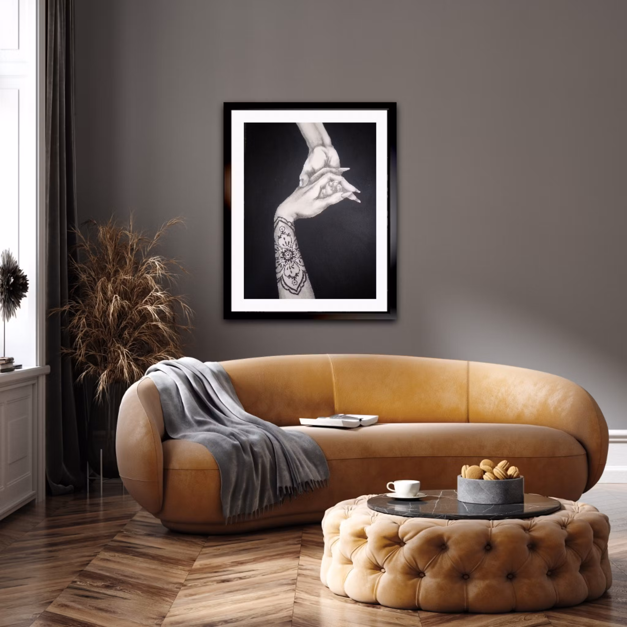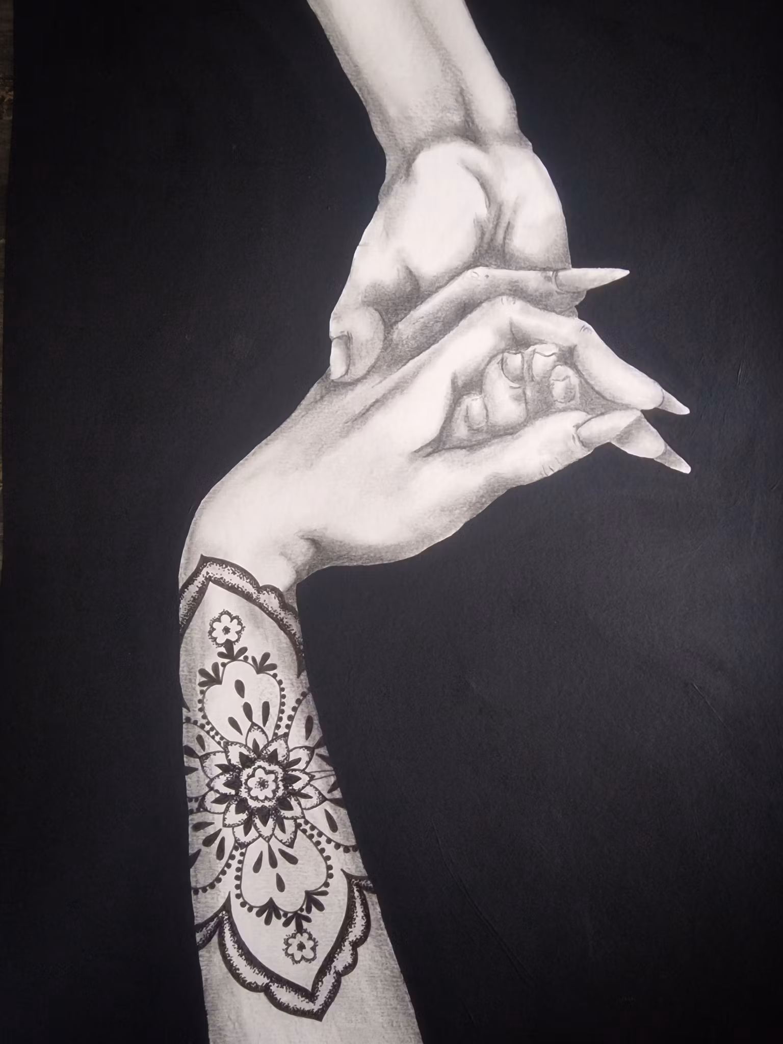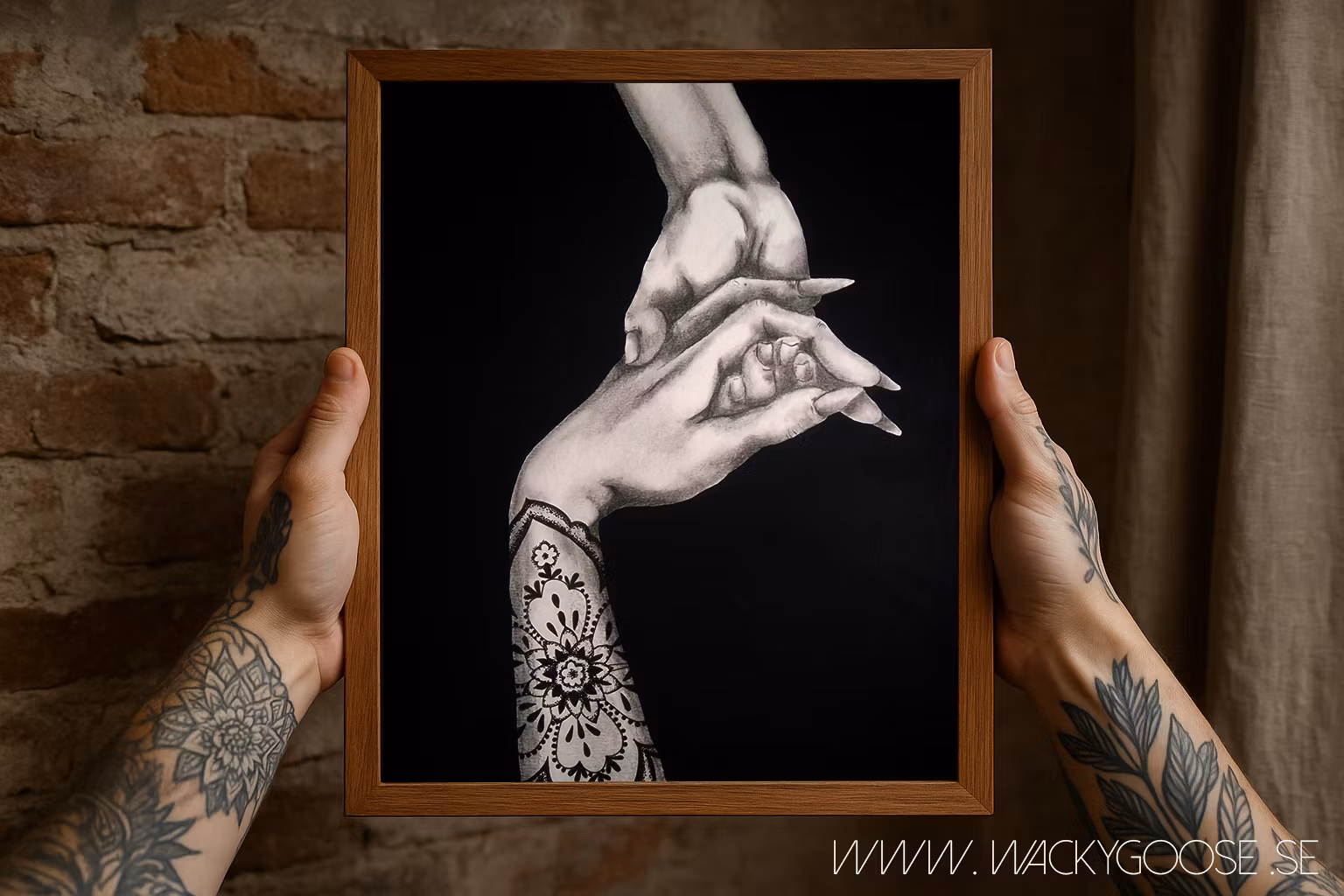 Motivet visar två händer som möts i en öppen, trygg gest - en mjuk, men tydlig påminnelse om att vänlighet är en styrka. På underarmen syns en blominspirerad tatuering, elegant ritad med precision och själ.