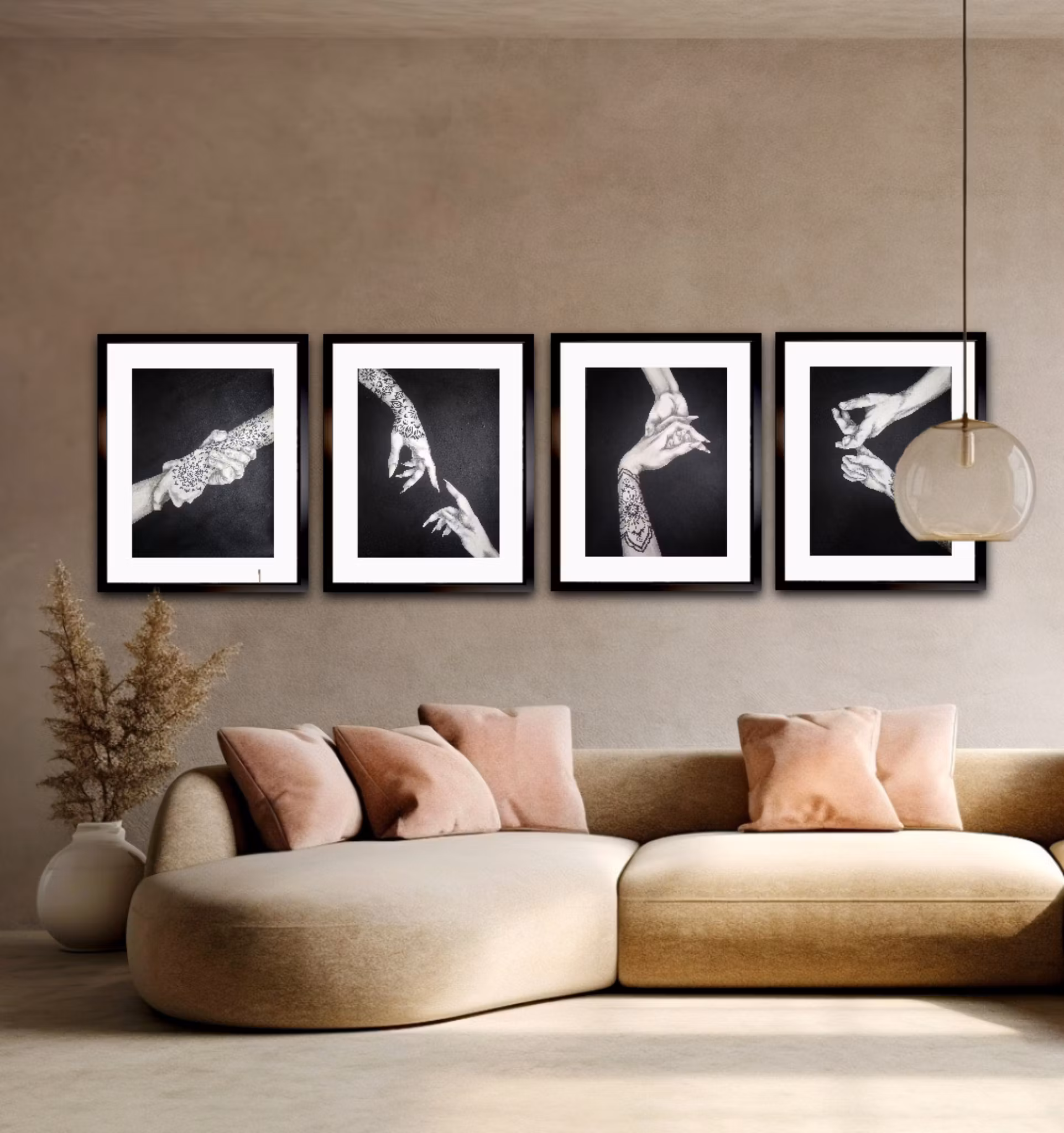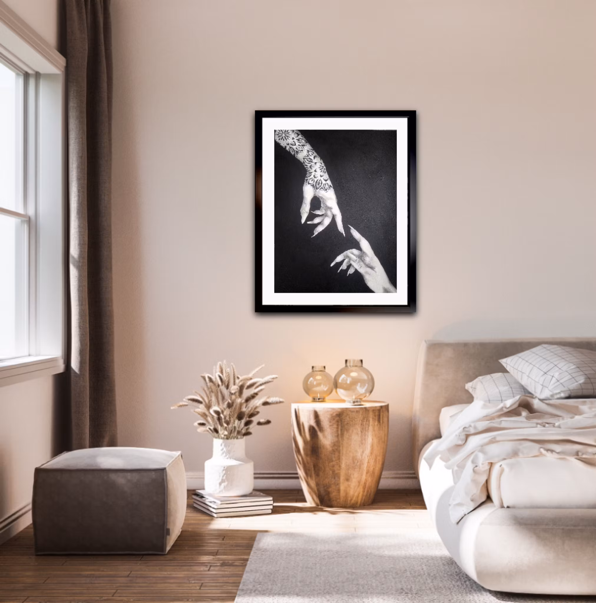 Två kvinnliga händer sträcker sig mot varandra i en tyst rörelse, där en av armarna pryds av en detaljerad mandalainspirerad tatuering. Kontrasten mellan närhet och avstånd gör denna målning djupt berörande.