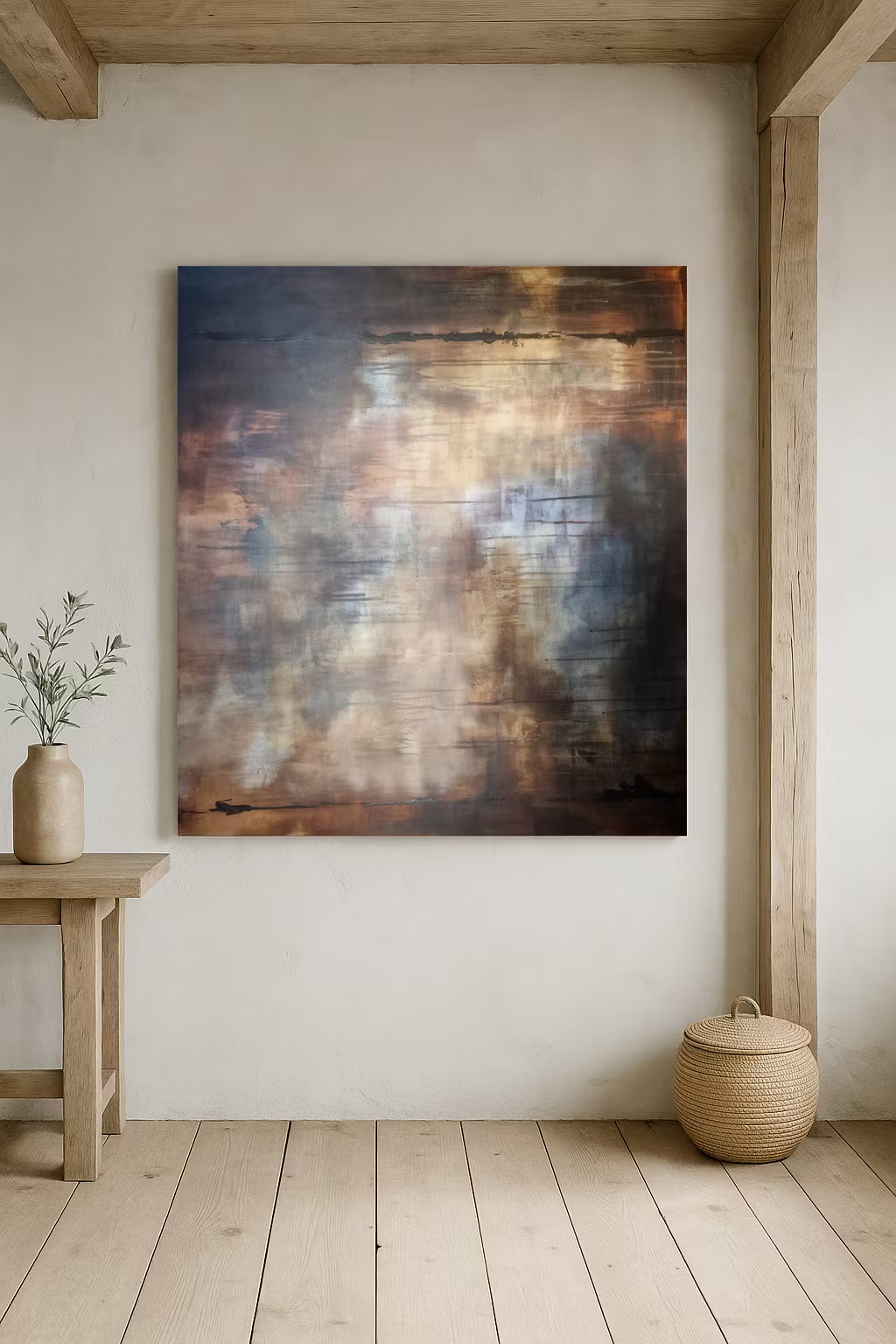 Verket återspeglar den råa skönheten hos naturliga ytor, som dimma som driver över ett kargt landskap. Det bjuder in betraktaren till en lugn men kraftfull atmosfär, perfekt för utrymmen som omfamnar rustik elegans och modern abstraktion.