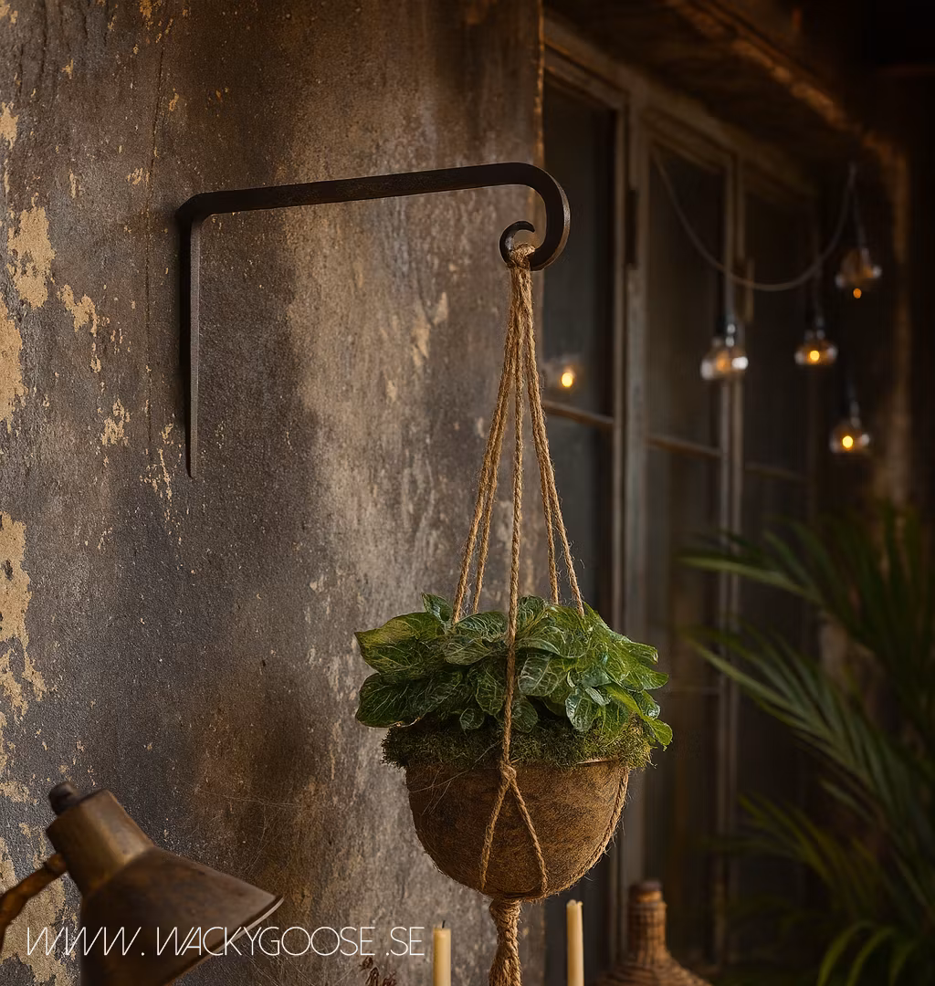 En kraftig krok/lykthållare i gjutjärn med rustik design, perfekt för att hänga upp lyktor, amplar, krukor eller andra dekorativa föremål. Den gedigna konstruktionen och tidlösa formen gör den lika vacker som funktionell, både inomhus och utomhus.