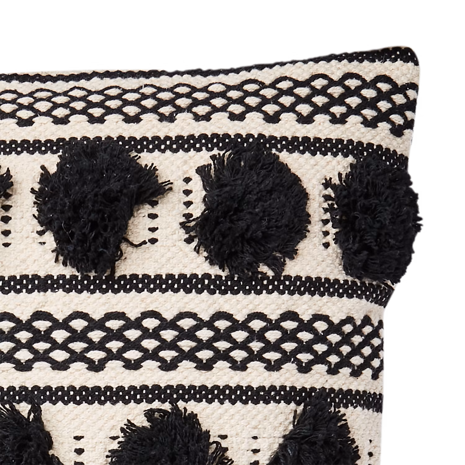 Ge din inredning en varm, bohemisk och livfull känsla med det här kuddfodralet i bomull. Ett stilrent kuddfodral i mjuk bomull med dekorativa fransmönster i trendig elfenben och svart nyans. Den levande strukturen skapar ett blickfång i soffan, fåtöljen eller sängen och bidrar med både karaktär och mysfaktor i ditt hem.