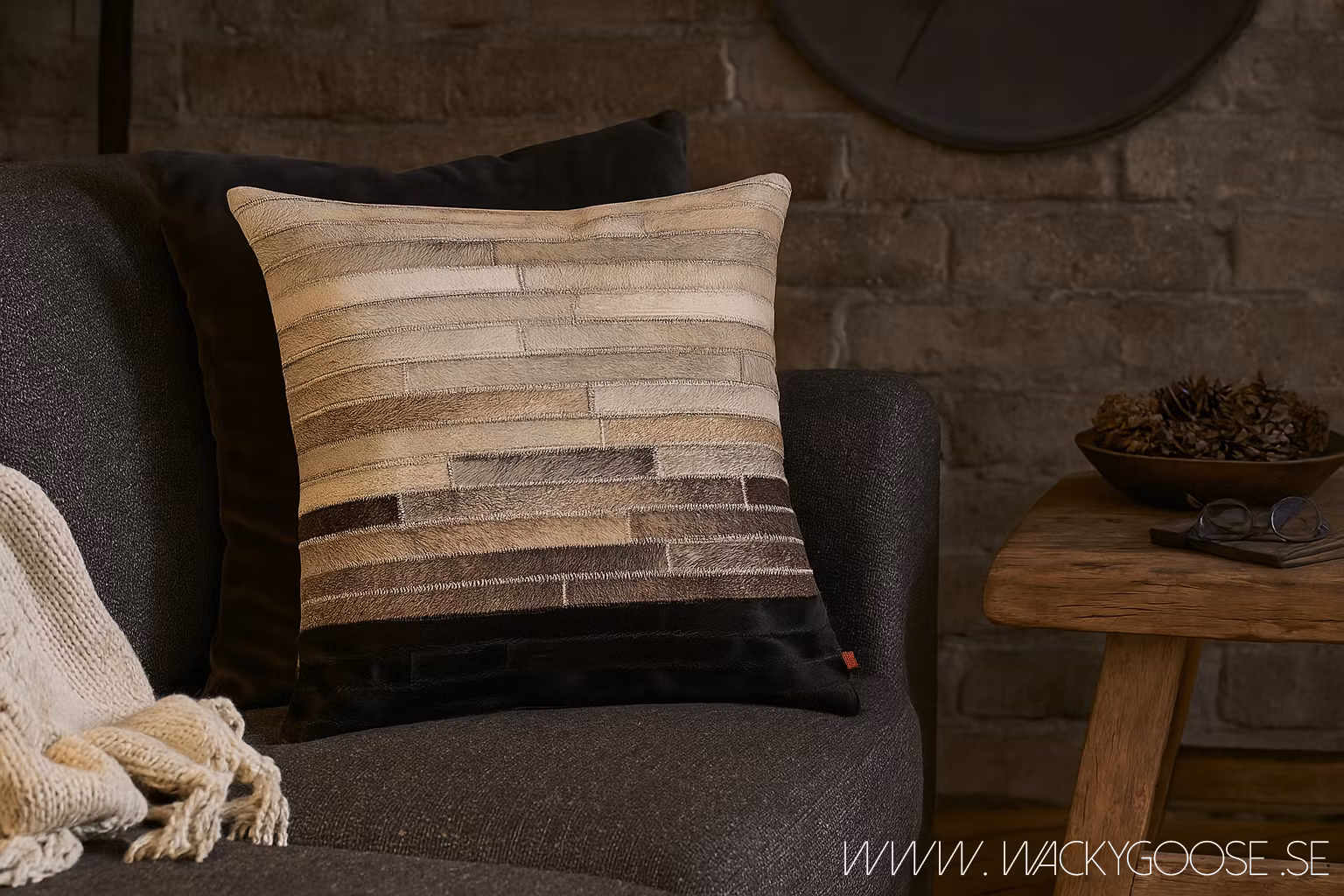 Skapa en varm och rustik känsla i ditt hem med det här läckra kuddfodralet - ett exklusivt kuddfodral i äkta kohud. Det unika patchworkmönstret i naturtoner av beige, brunt, grått och svart ger ett levande intryck med organiska skiftningar, som passar perfekt både i bohemiska, industriella och moderna miljöer.