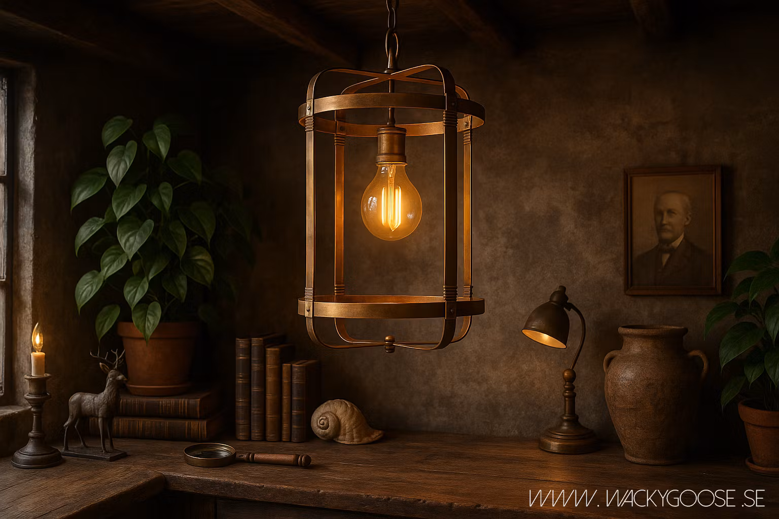 Elegant lampstomme i mässingfärgad järn - en perfekt bas för att skapa din egen unika lampa. Den öppna konstruktionen ger ett luftigt och industriellt uttryck, samtidigt som färgtonen i mässing tillför värme och karaktär.
