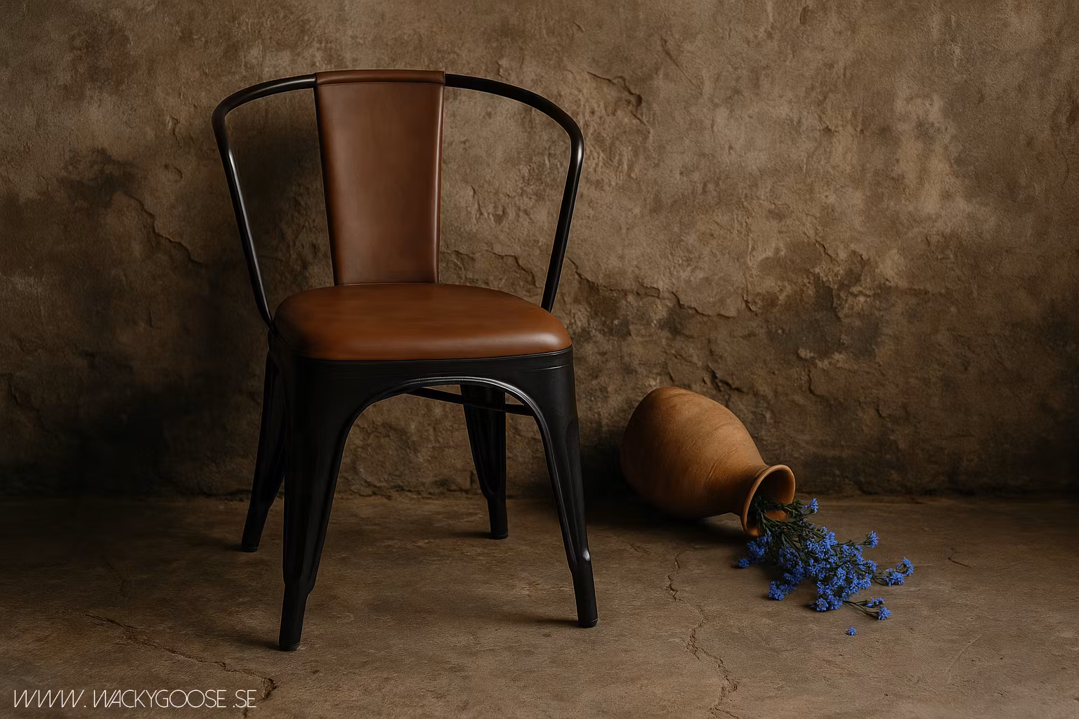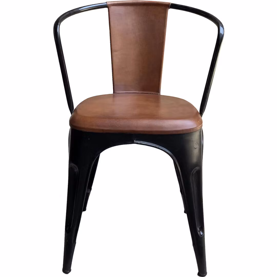 Living matstol med armstöd kombinerar rå design och funktionalitet på bästa sätt. Med sin robusta ram i svartlackerat järn och sits och rygg i konjaksfärgat läder, utan klädsel, skapar stolen en sval och industriell atmosfär. Den är stapelbar vilket gör den praktisk för både privata och professionella miljöer som caféer eller restauranger.