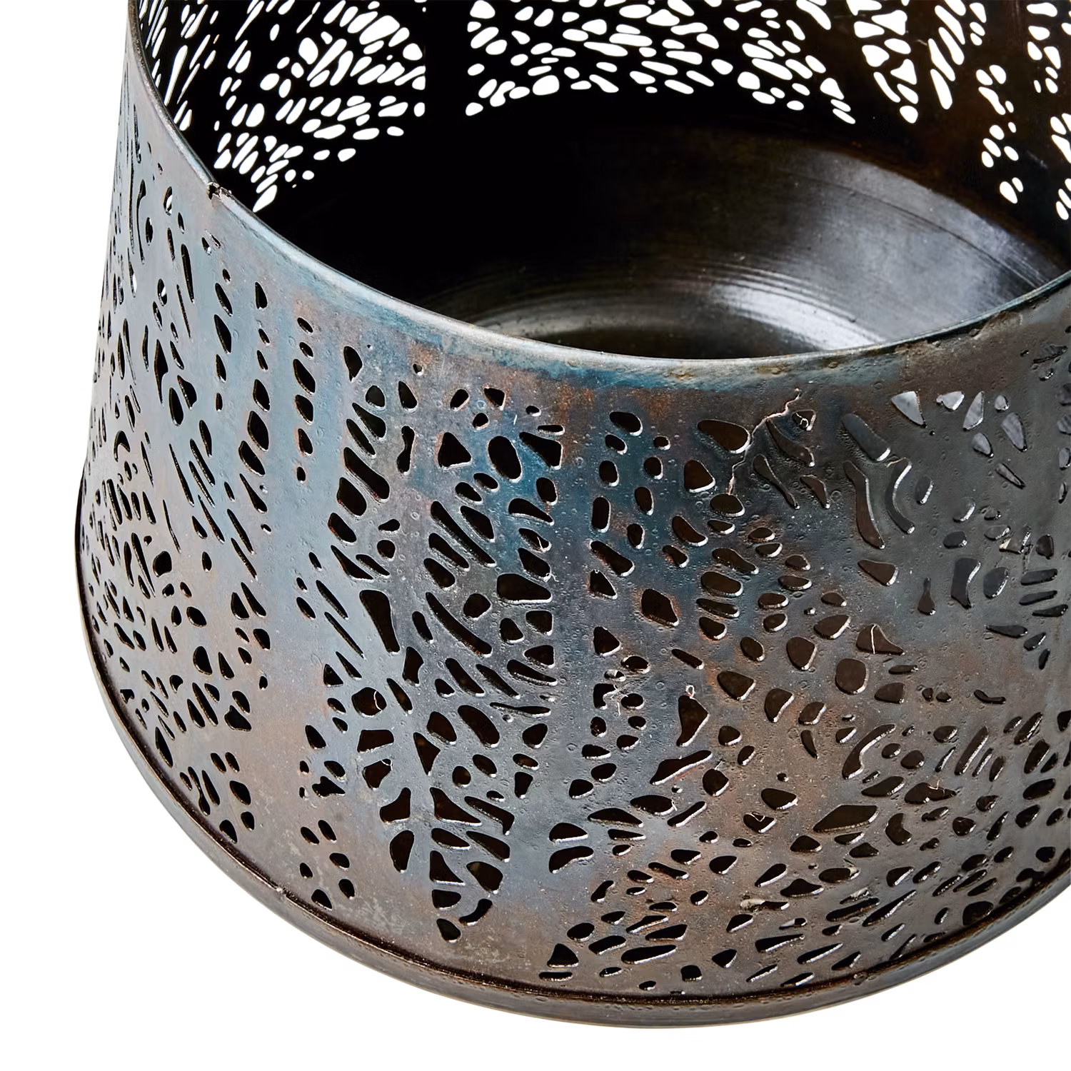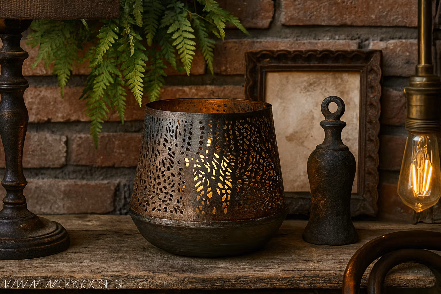 En vacker och bohemisk lykta tillverkad i järn med stansat mönster som sprider ett stämningsfullt ljusspel. Den rustika designen kombinerar råa metallinslag med mjuka former, vilket ger en varm och inbjudande atmosfär. Perfekt som dekorativ detalj på fönsterbrädan, soffbordet eller hängande i en krok.