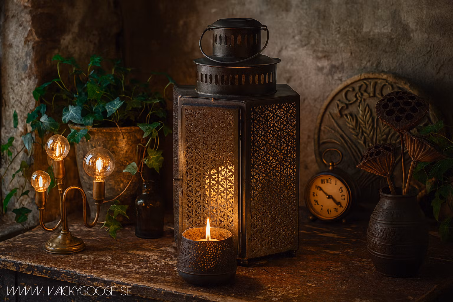Den är lika vacker inomhus som utomhus och kommer fortsätta patineras om den utsätts för fukt vilket skulle ge ännu mera karaktär och genuin känsla till lyktan.