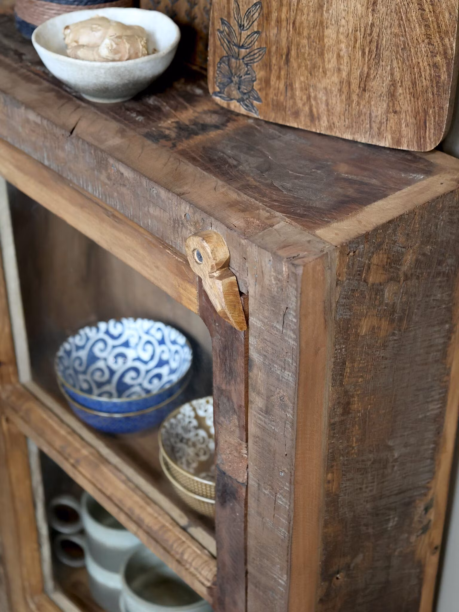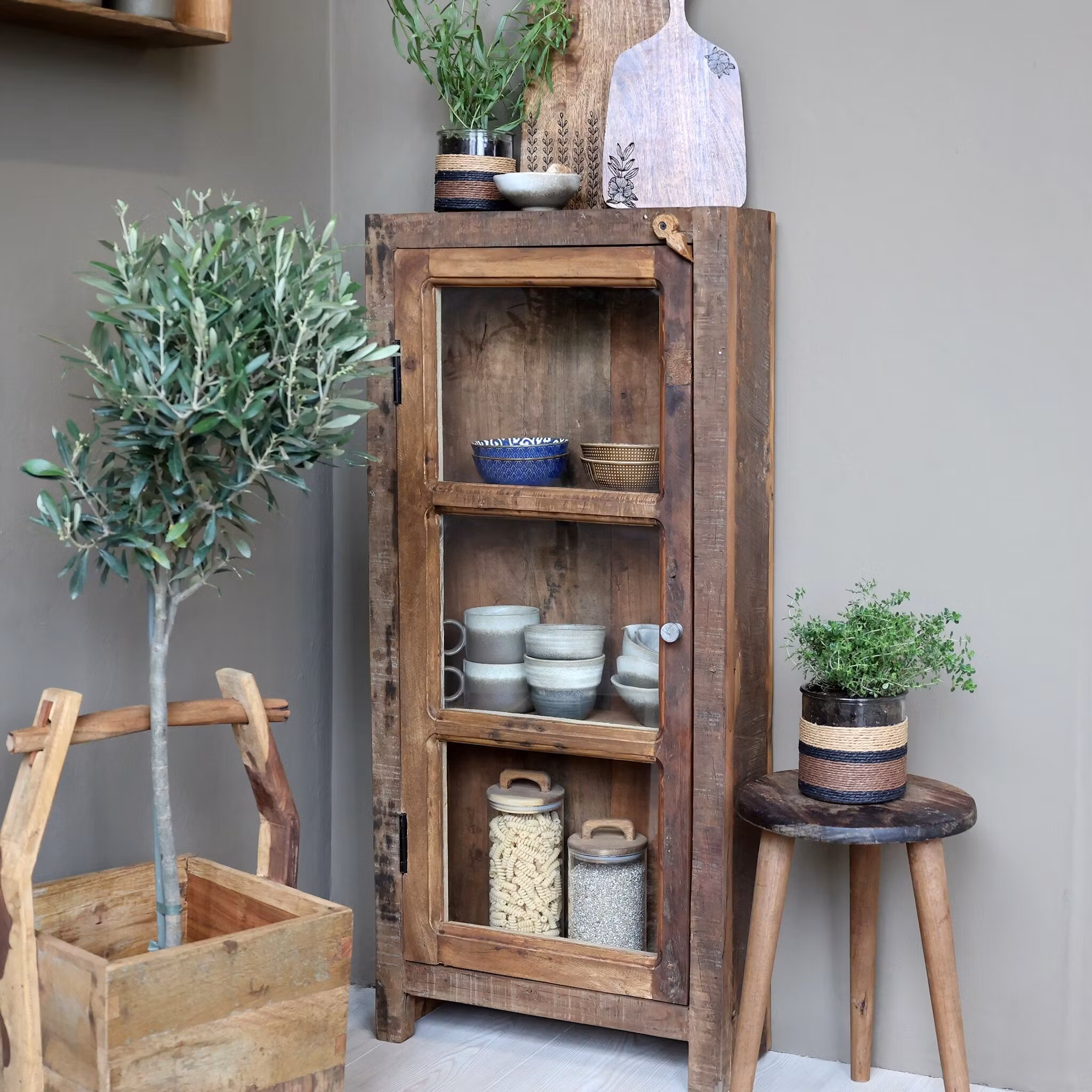 Ett charmigt och hållbart skåp tillverkat av återvunnet trä, där varje detalj bär spår av sin unika historia. Med sin smala form och rustika yta är det perfekt för dig som vill ha praktisk förvaring utan att ta upp för mycket plats. Skåpet fungerar lika bra i köket, hallen eller vardagsrummet och blir en karaktärsfull inredningsdetalj.