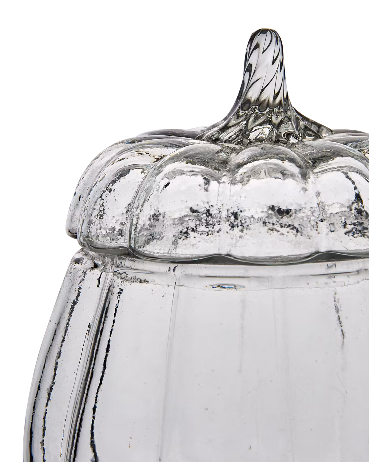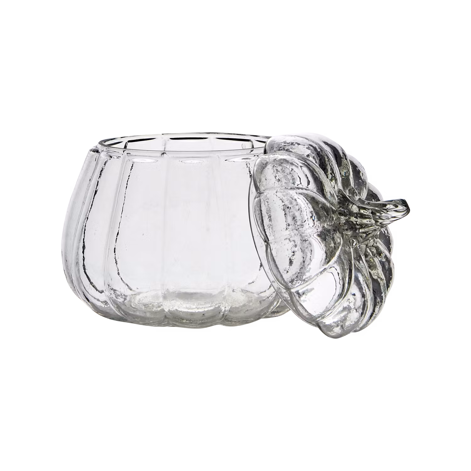 Vacker pumpaskål med lock i glas, perfekt för godis, dekorationer eller småförvaring. Skapar en härlig höst- eller halloweenkänsla i hemmet.
