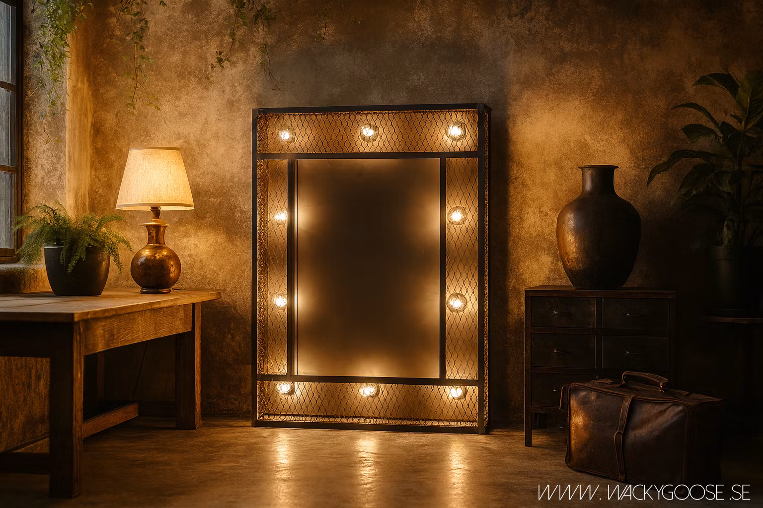 Väggtavla med coola ljusdetaljer med plats för 8 glödlampor. Väggtavlan är tillverkad av patinerat järn vilket ger tavlan ett coolt rått industriellt utseende.