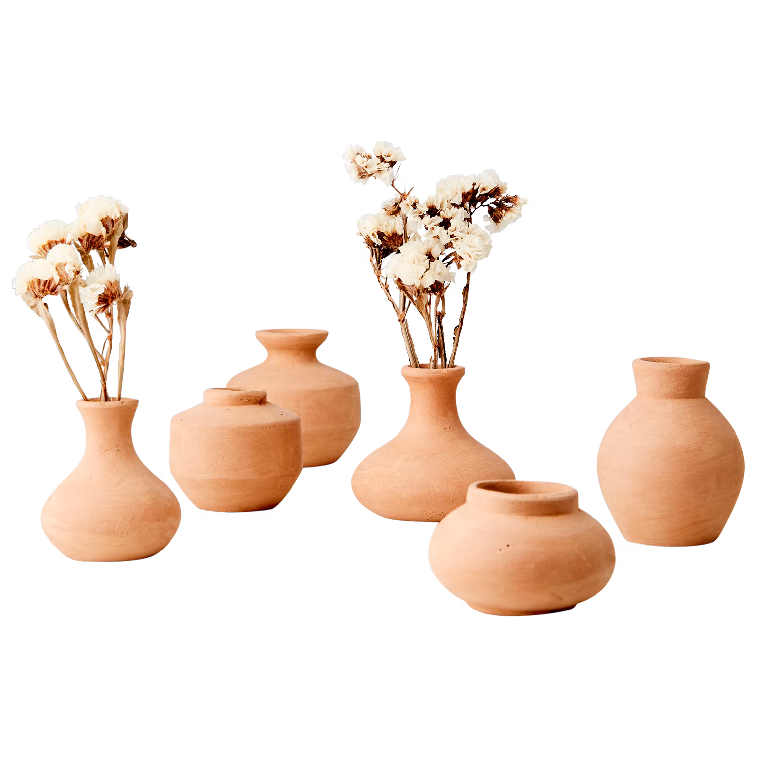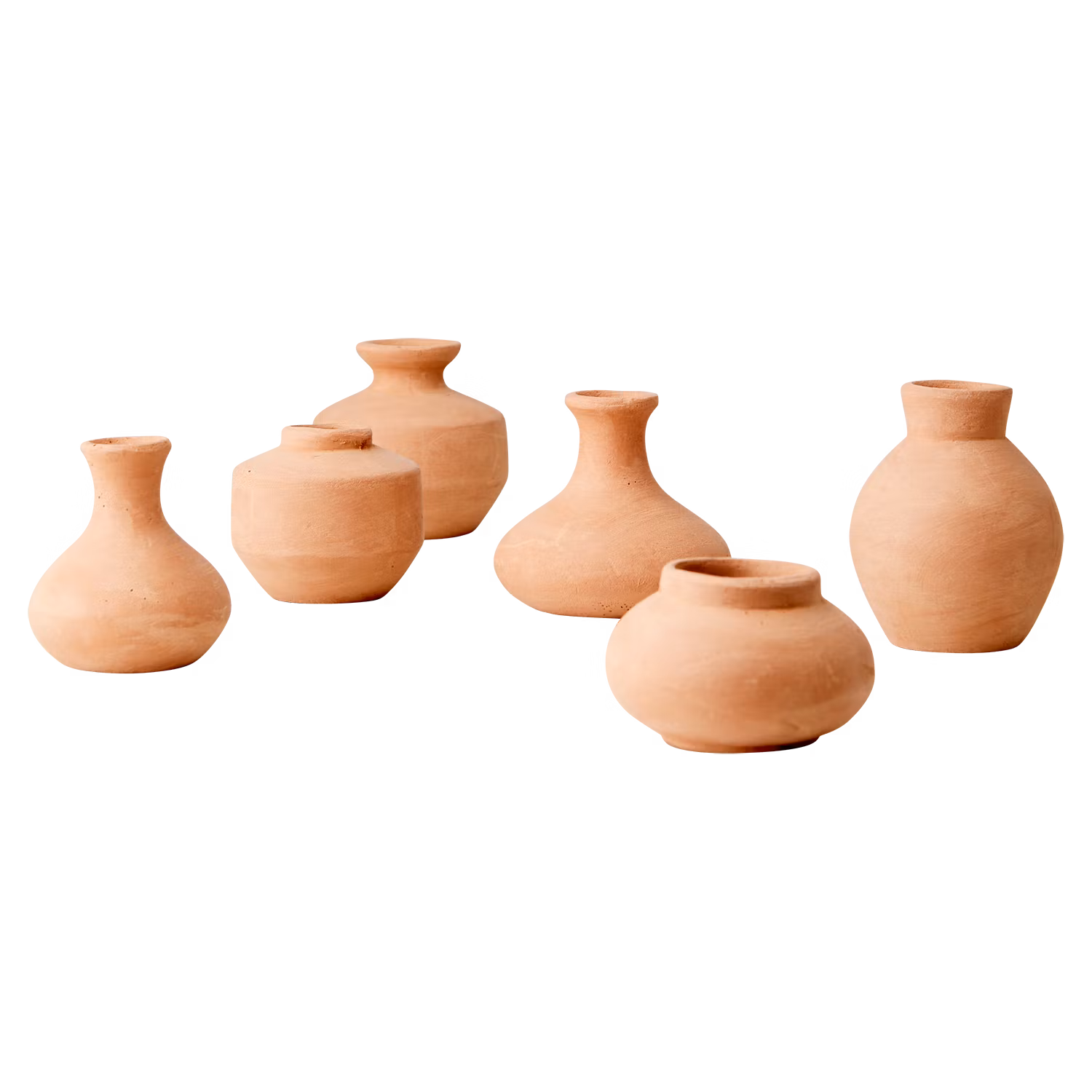 Ett charmigt set med 6 små, handgjorda urnor i varm terrakotta. Varje vas är unik i både form och yta, vilket ger ett levande och personligt uttryck till ditt hem. Perfekta att ställa tillsammans som stilleben eller att använda var för sig med torkade blommor, strån eller små kvistar.