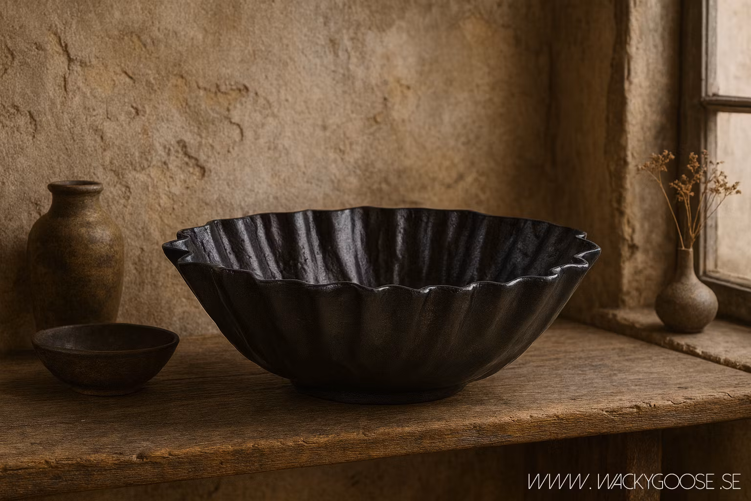 Rustik skål i mörkbrun metall med snygg patinerad känsla. Perfekt till frukt, dekorationer eller som stilren detalj på bord och hylla.