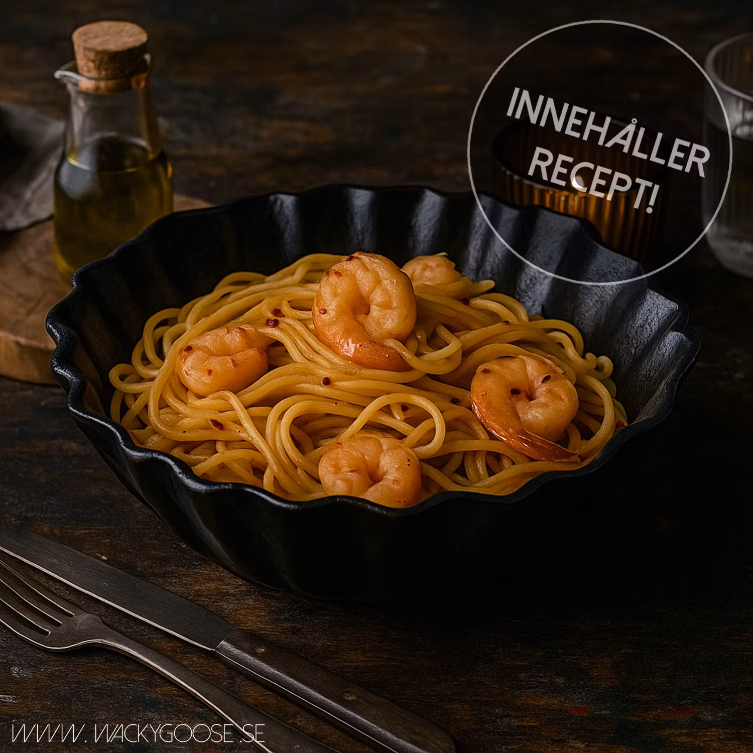 Här bjuder vi på receptet på Linas CHILLI RÄKPASTA (serveras med spagetti), uppe bland bilderna ser du både ingredienser och hur du ska göra!