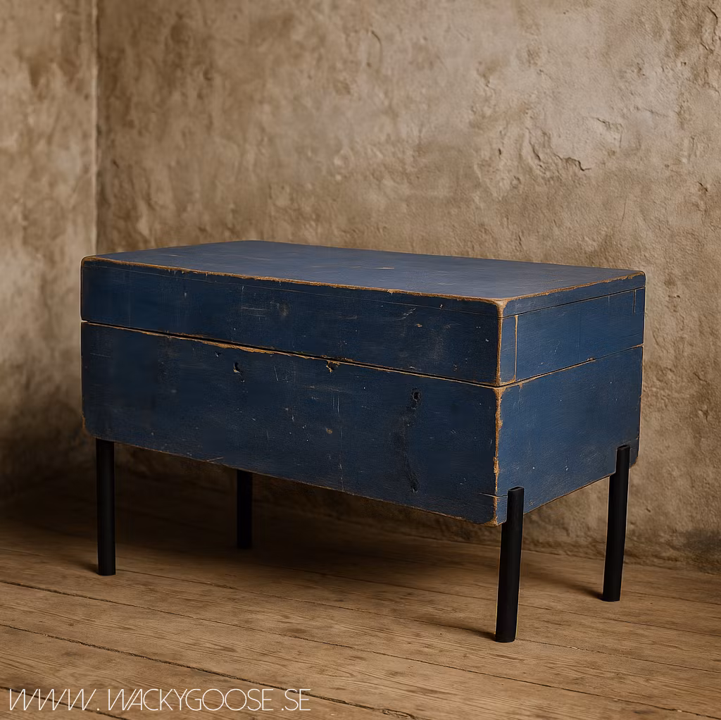 Härligt soffbord/sidobord med förvaring. Stor träkista i originalfärg med metallben.