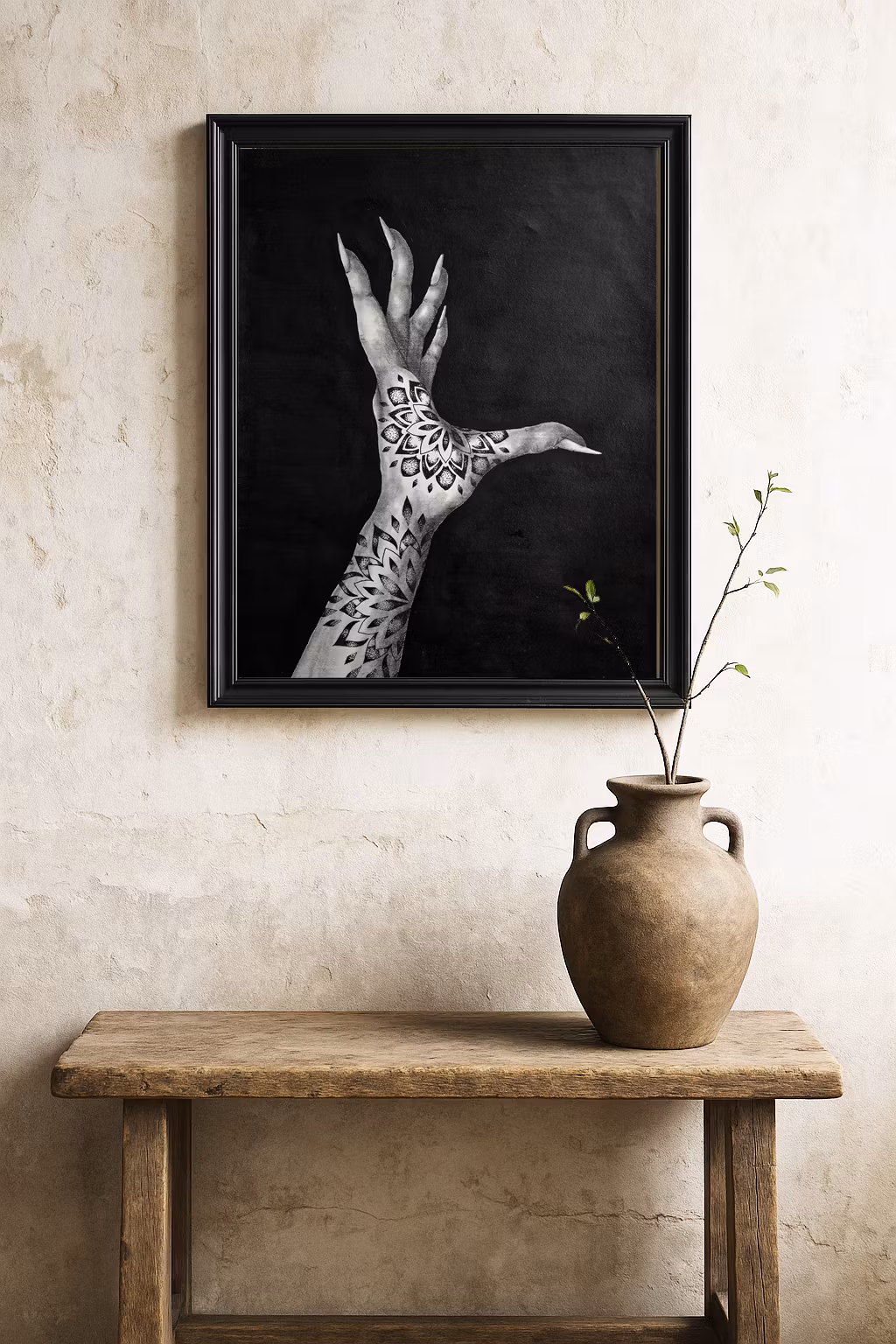 Denna svartvita tavla visar en tatuerad kvinnlig hand i frigörelse, fångad i en kraftfull gest som trotsar normer och förväntningar. Med hypnotiska mandalatatueringar och långsmala, självklara fingrar, blir det här ett statement för mod, frihet och integritet.