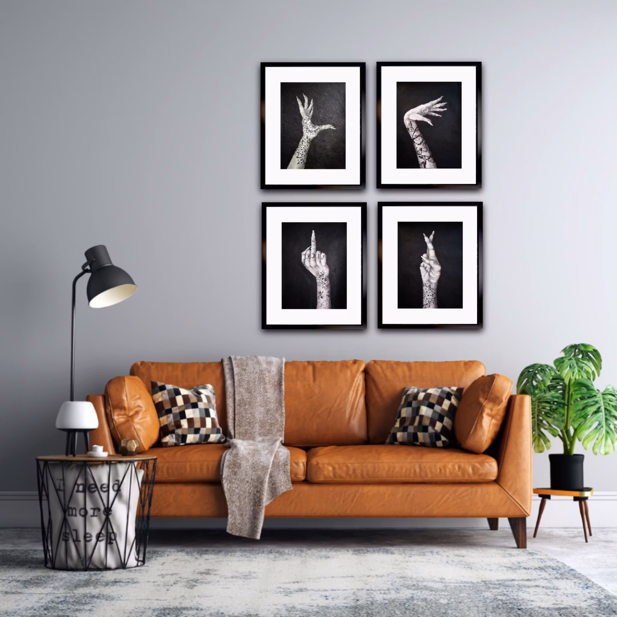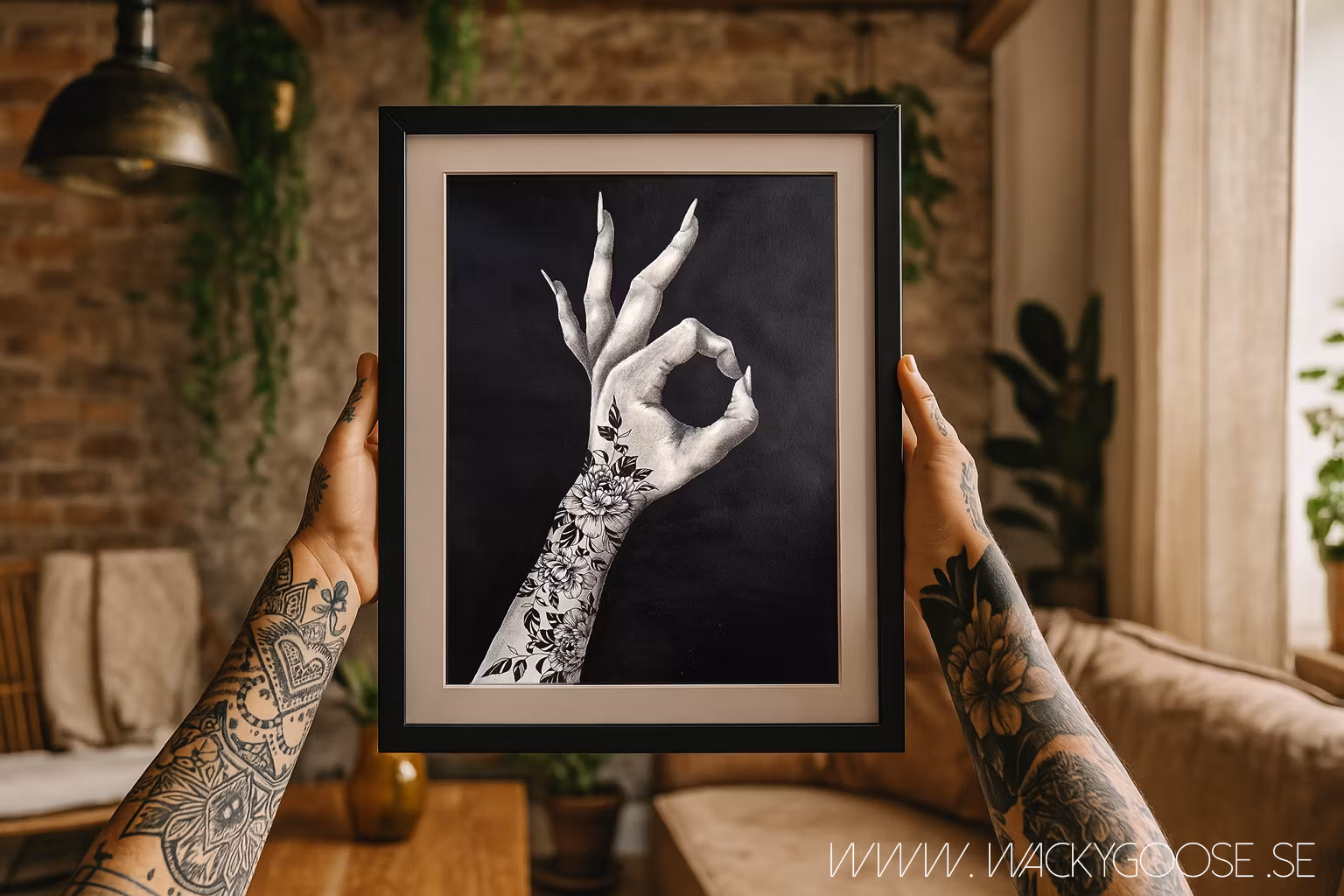 Målningen visar en elegant kvinnlig hand i den klassiska OK-gesten, med den detaljrik blomtatuering längs underarmen. Symbolen för balans, acceptans och självklar närvaro möter skönheten i det organiska.