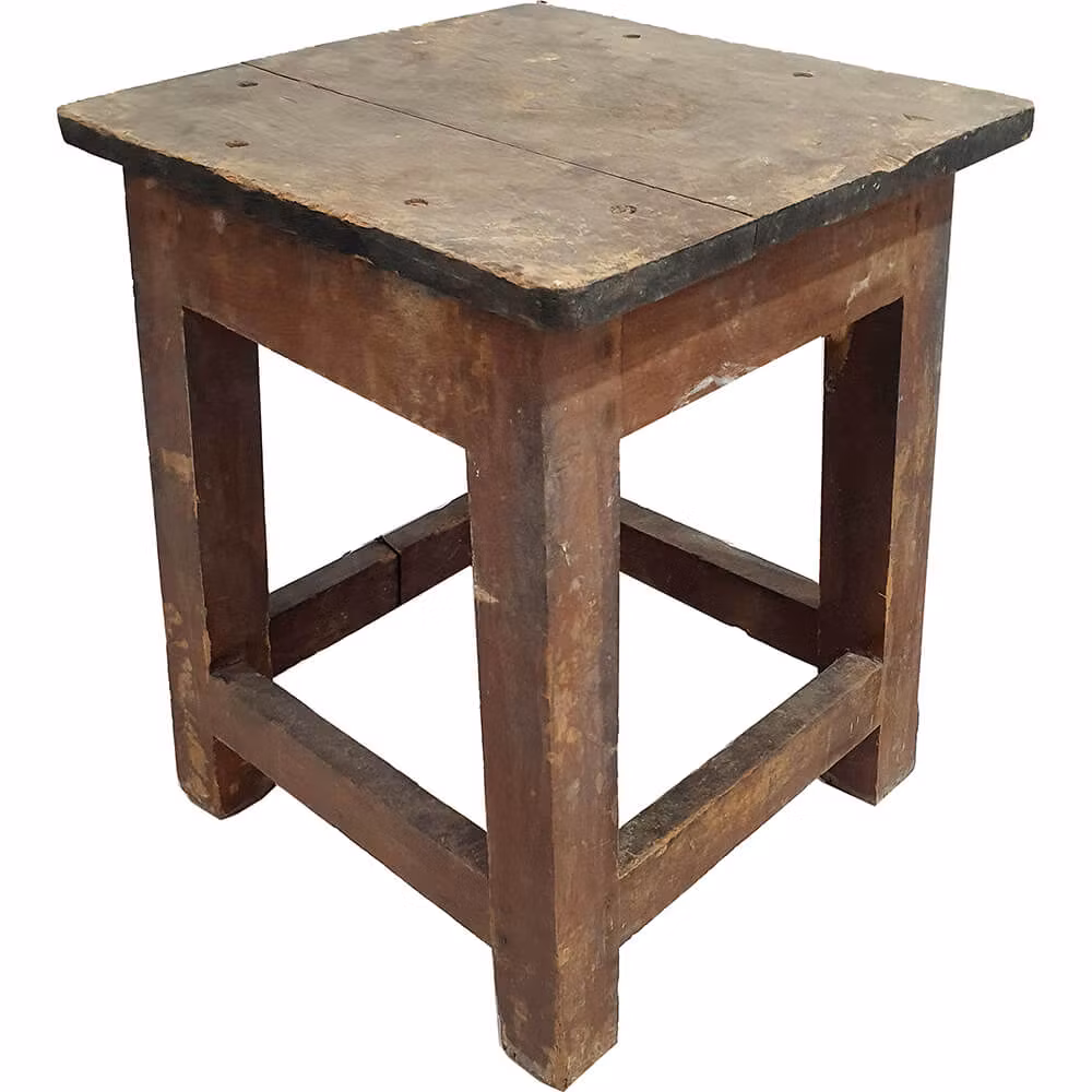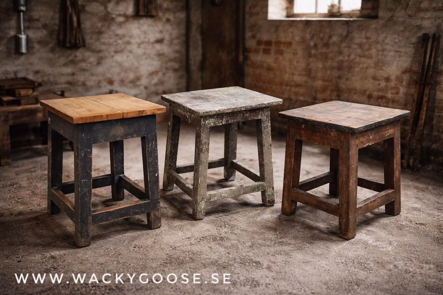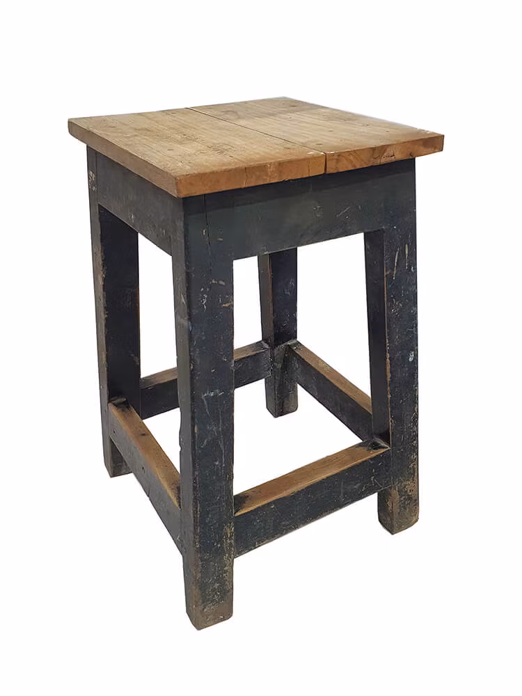 Dessa gamla träpallar är tillverkade av massivt trä och har alla tydliga spår av många års användning. Slitna ytor, märken, ojämnheter och variationer i både färg och patina. Vissa har rester av gammal färg, andra är mer råa i träet, vilket ger ett levande och autentiskt uttryck. Det kan finnas skillnader i både höjd, bredd och proportioner, och just denna skillnad är en del av charmen. Varje pall har sin egen särprägel och sin egen historia. Pallarna kan användas för många ändamål: som extra sittplatser, små sido- eller växtbord, nattduksbord eller som stämningsskapande element i en butik, café eller heminredning. De fungerar både individuellt och tillsammans, där variationen framhäver det råa och originella uttrycket. Ett karaktärsfullt lott för dig som uppskattar genuina material, spår av användning och möbler med historia.