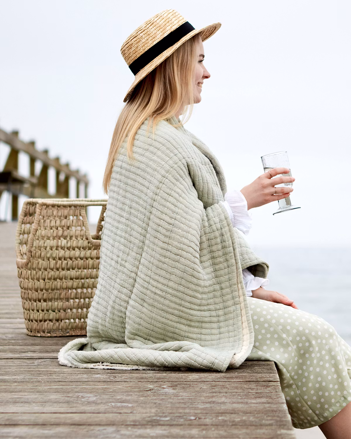 Filten mäter 200x130cm - en generös storlek som gör den perfekt att svepa in sig i under svala kvällar, eller använda som ett dekorativt överkast. Den ljusa, dämpade gröna nyansen passar utmärkt i såväl bohemiska som skandinaviska inredningar.