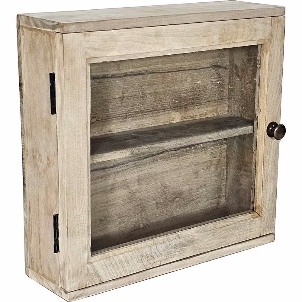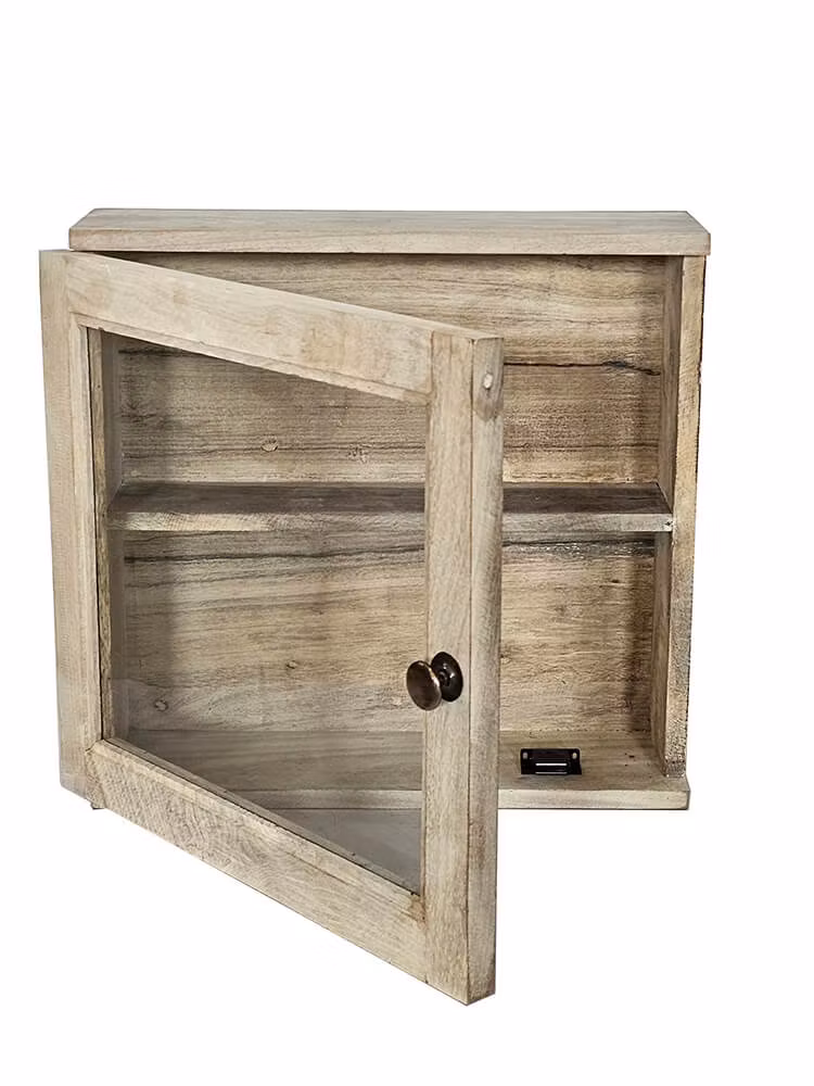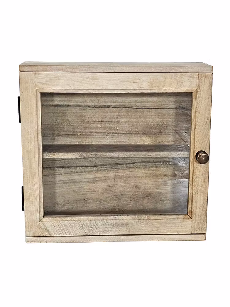 Charmigt och praktiskt litet väggskåp med glasdörr och en hylla. Skåpet är tillverkat av återvunnet trä, vilket ger det en naturlig och rustik charm. Glasdörren låter dig visa upp dina favoritsaker. Placera det i caféet, badrummet eller köket för att skapa en mysig atmosfär och organisera dina småsaker på ett elegant sätt. Avståndet mellan hyllorna är 21 cm.
