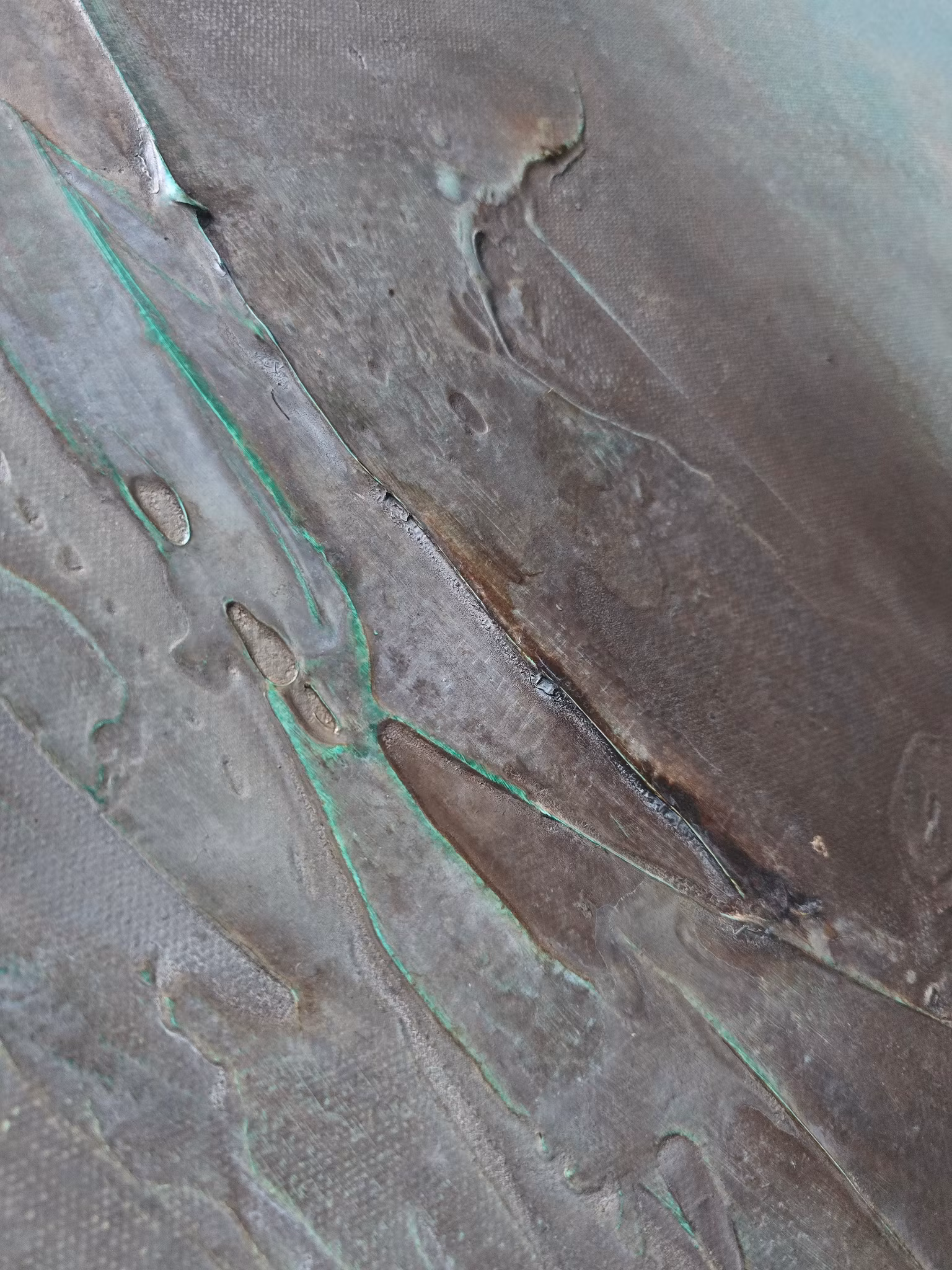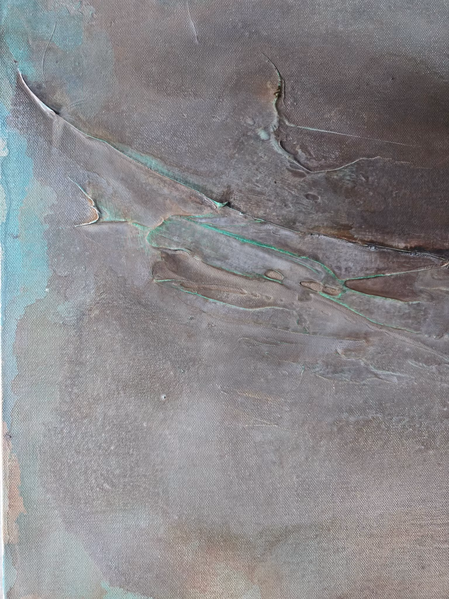 "Askfärgad horisont" från min serie 'Jordens ådrar' fångar den tysta poesin av erosion och tid. Mjuka toner av dimmig turkos och jordig taupe blandas till texturerade, väderbitna lager som framkallar känslan av forntida landskap som långsamt formas av vind och vatten.