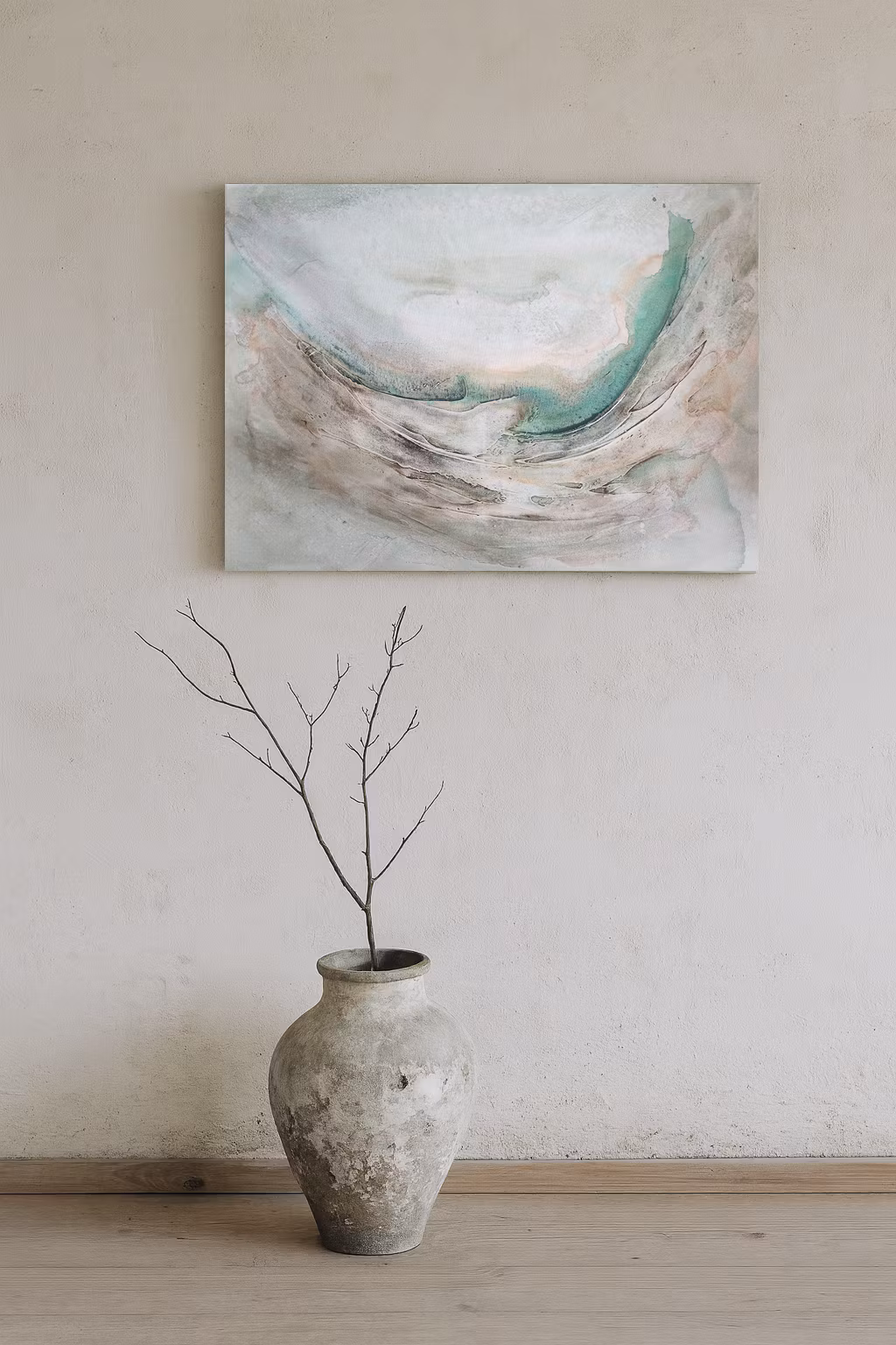 "Whispers of Earth" från kollektionen 'Elements in motion' är en abstrakt målning som fångar naturens stilla poesi. Milda toner av beige, vitt och mjukt grått möts av böljande grönt, vilket framkallar känslan av landskap format av vind, jord och tid.
